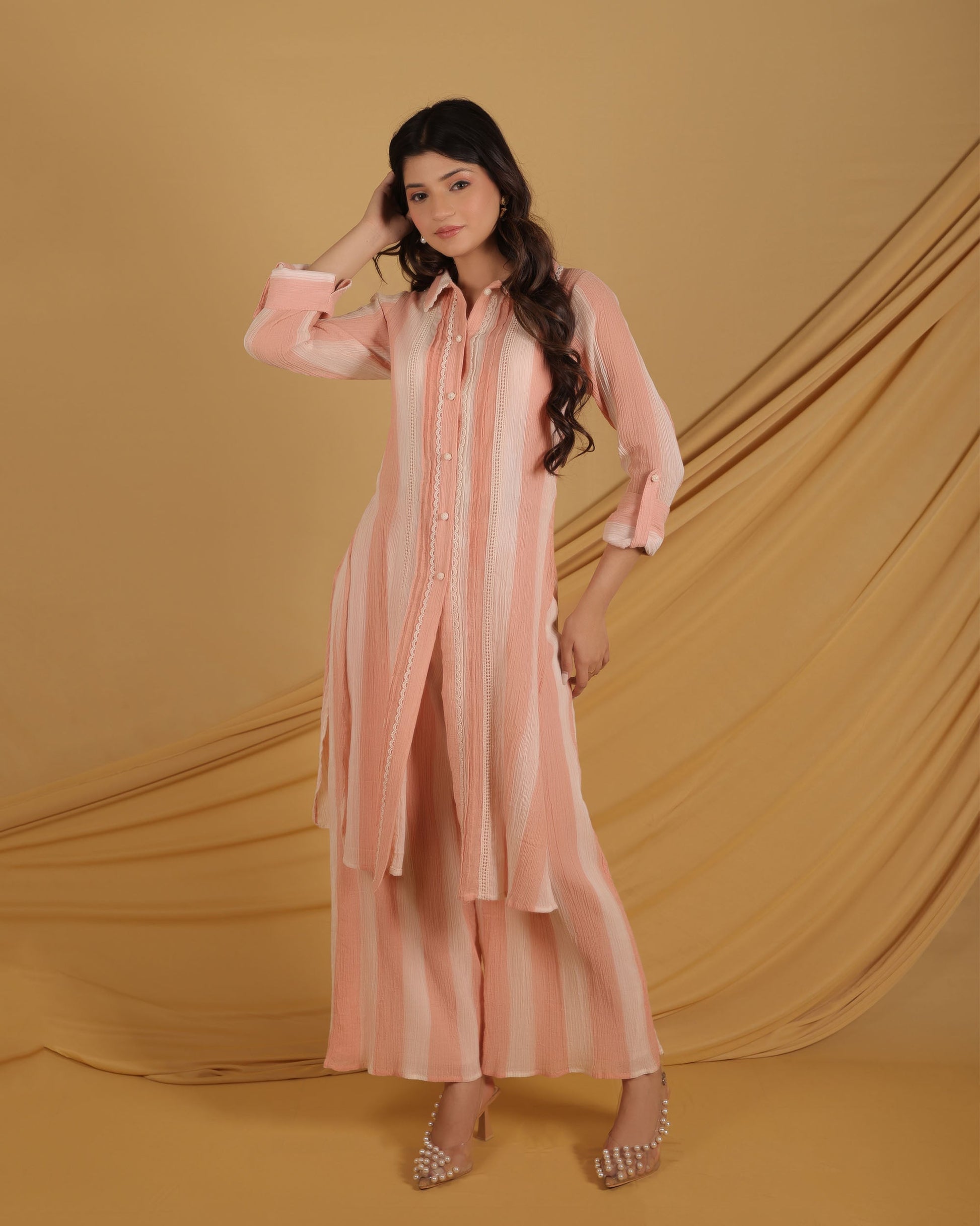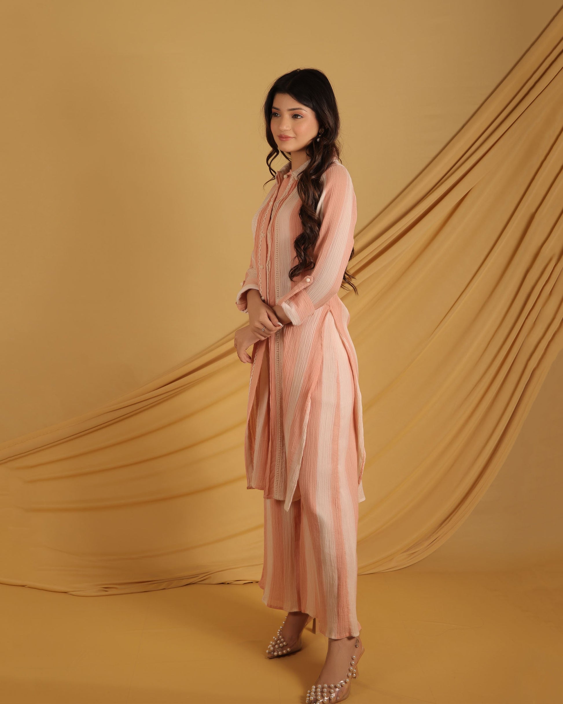 This two-piece kurta & pant set features a vertically striped kurta and matching pants. The kurta, in a soft blend of peach and off-white, has a collared neckline and long sleeves adorned with lace and crochet buttons. The pants echo the kurta's color palette and feature a comfortable, wide-leg cut. Sold a s aset of Upper and Lower.