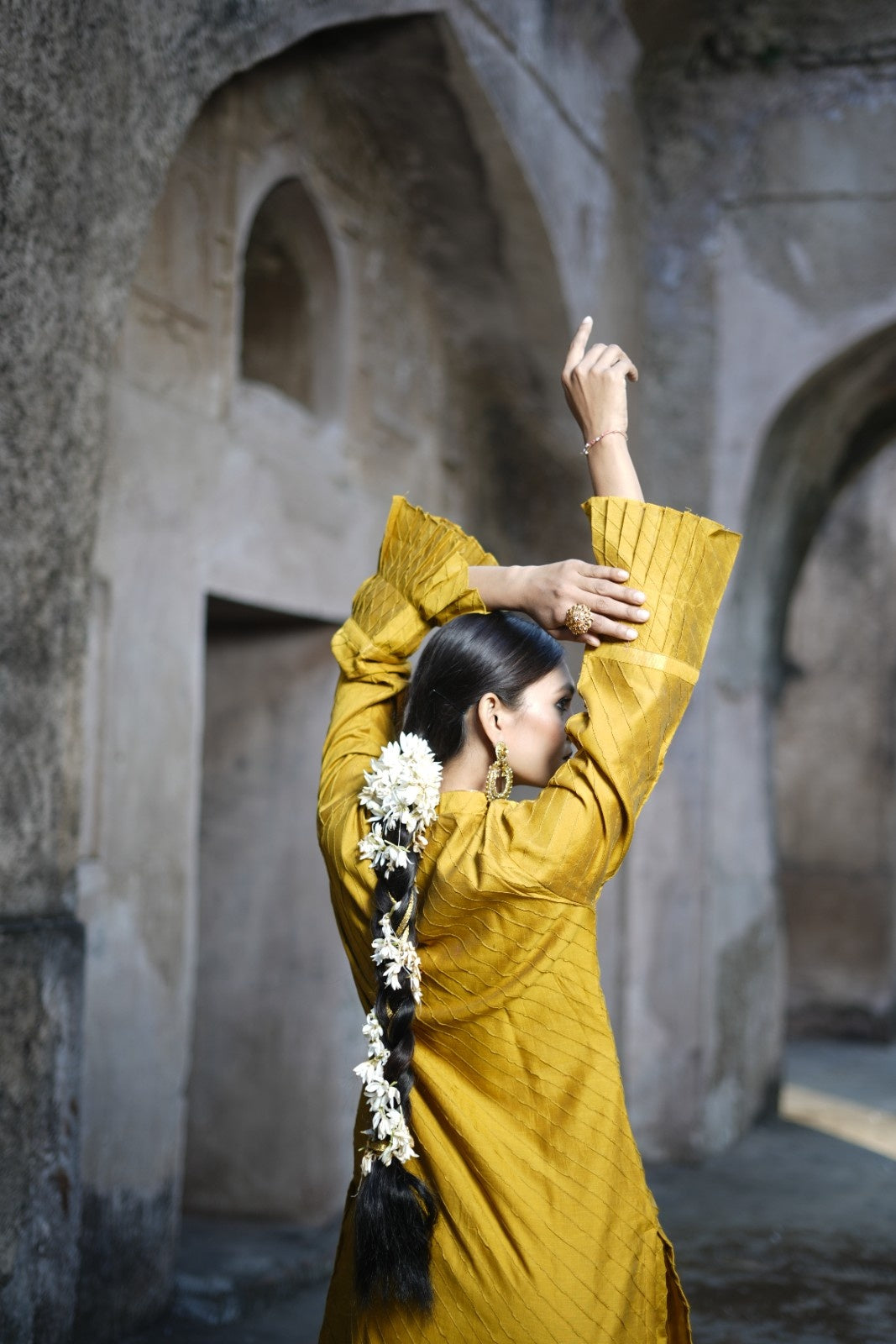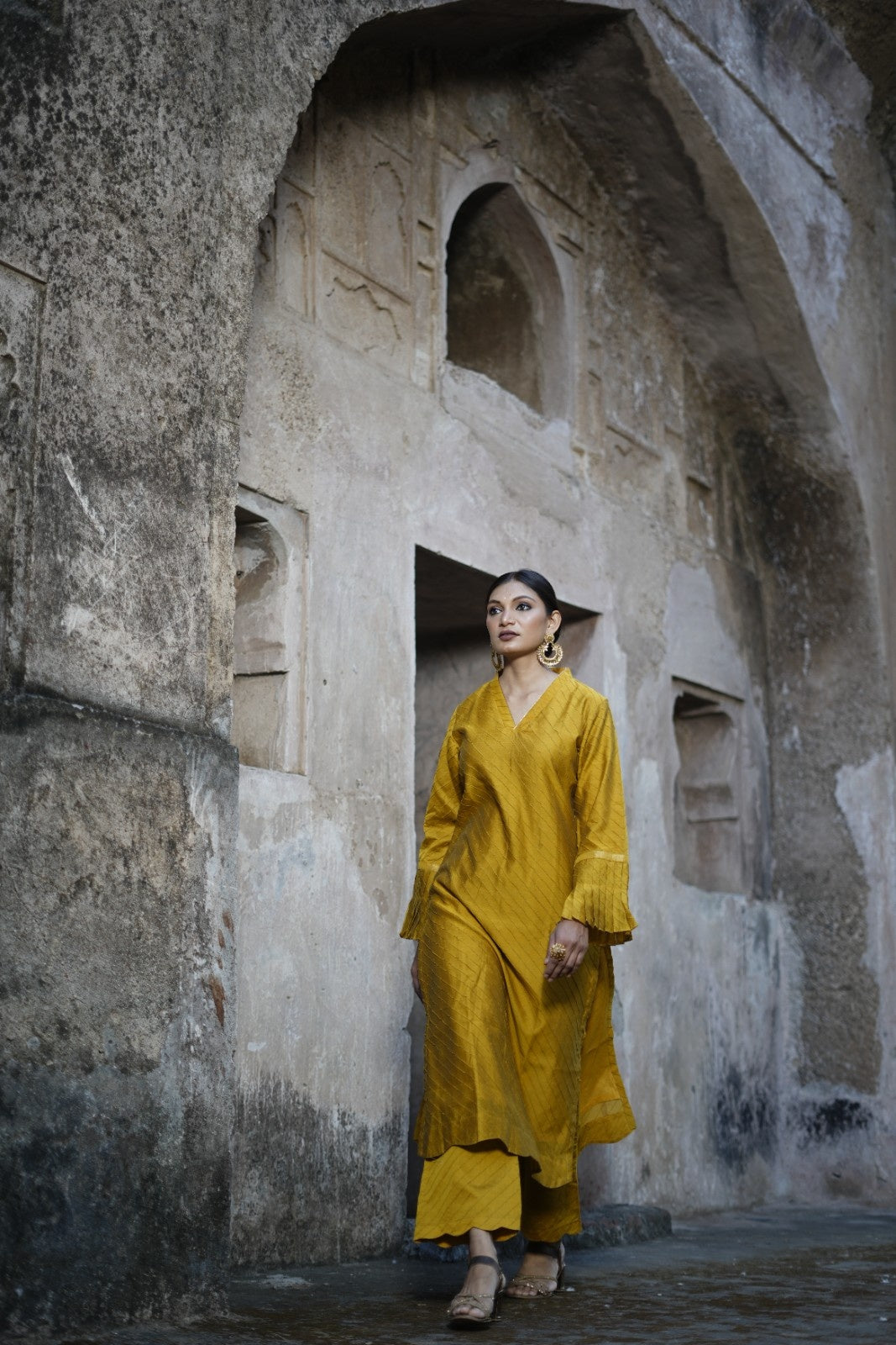 This elegant semi Chanderi kurta set is a perfect choice for wedding wear and festive occasions. The straight-cut kurta features all-over pintuck detailing, a stylish collar neckline, and delicate frill accents on the sleeves for a contemporary ethnic look. Scalloped hems on both the kurta and wide-leg pants add a refined handcrafted finish, while side slits enhance comfort and movement. The wide-leg scalloped pants are designed with a half-belt and half-elastic waistband for a flattering yet comfortable fit. Ideal for weddings, festive celebrations, and special occasions.