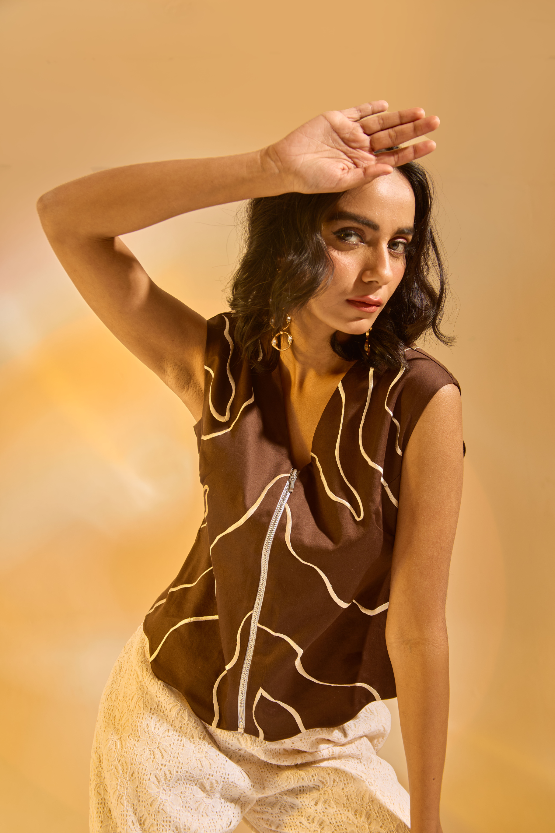This textured top features a wavy hem and a front zipper, A beautiful fusion of modern structure and delicate texture.