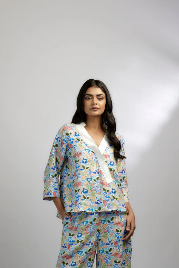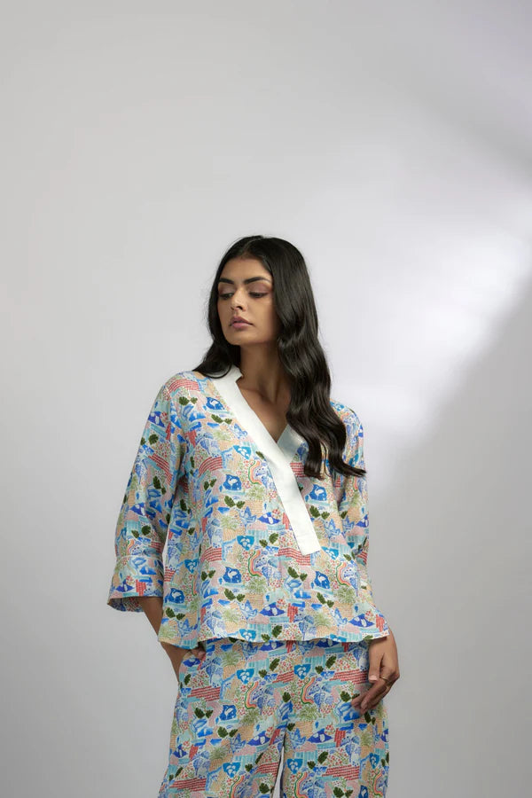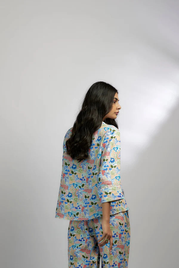 Our Swan Coord Set is crafted from sustainable hemp fabric with intricate detailed prints. The set consista of a boxy top which has a plain white panel detailing along the neckline with white collar detail. The trousers are lightly flared featuring wave embroidery on the hemline.