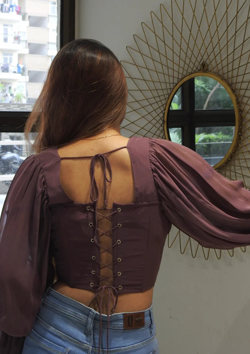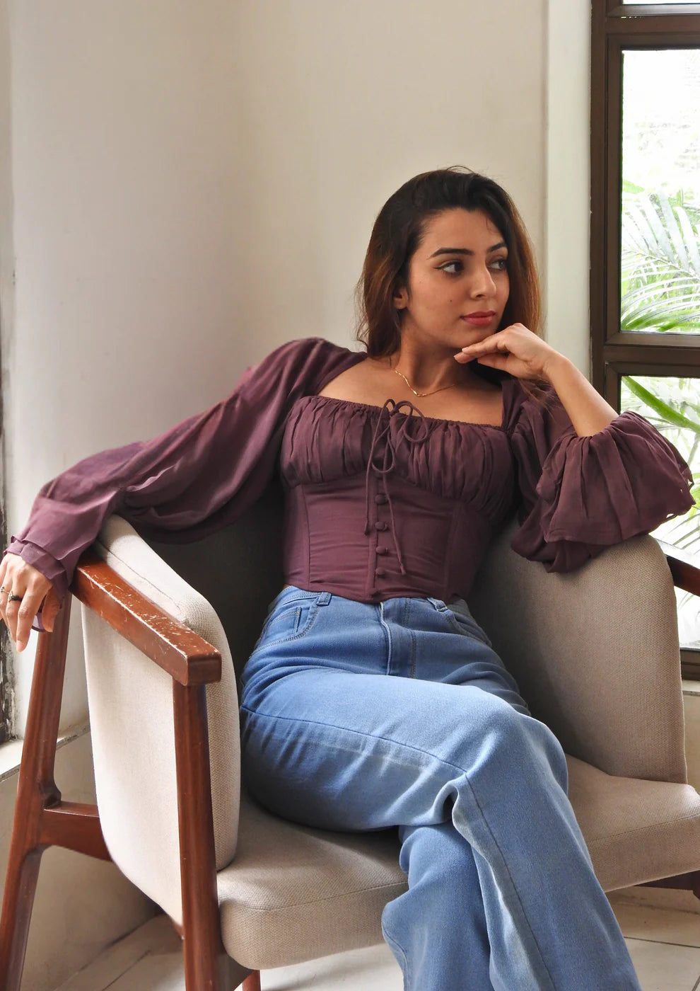 A whispered pour of wine, held in every gather — the Sylvie top charms with frilled sleeves, a gathered bustier, and a criss-cross back full of allure.