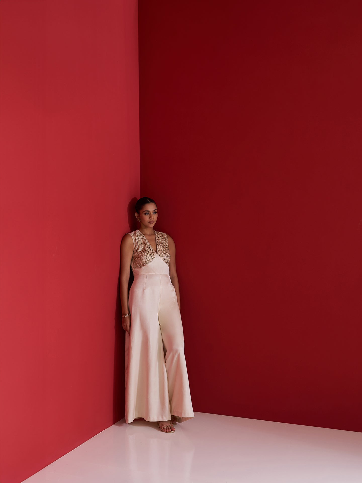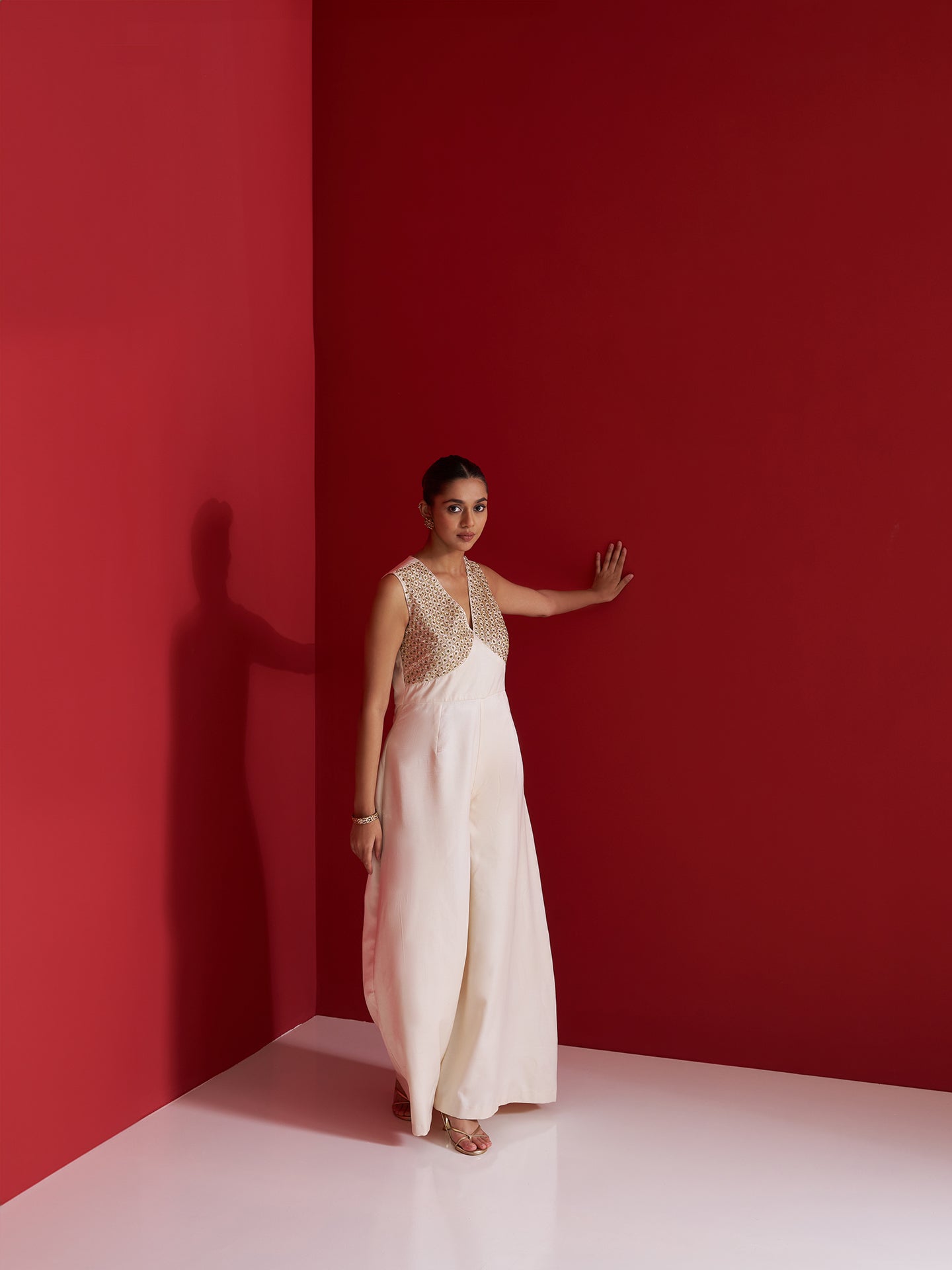 Striking a perfect balance between modern elegance and traditional craftsmanship, this ivory jumpsuit is tailored in fluid Gajji silk for a luxurious drape. The sleeveless bodice features intricate hand embroidery using naqshi, green moti, and sequins, forming a delicate shimmer with a subtle contrast. Designed with a flattering V-neck and wide-leg silhouette, this piece makes for a refined statement at cocktail soirées, festive gatherings, or destination celebrations.