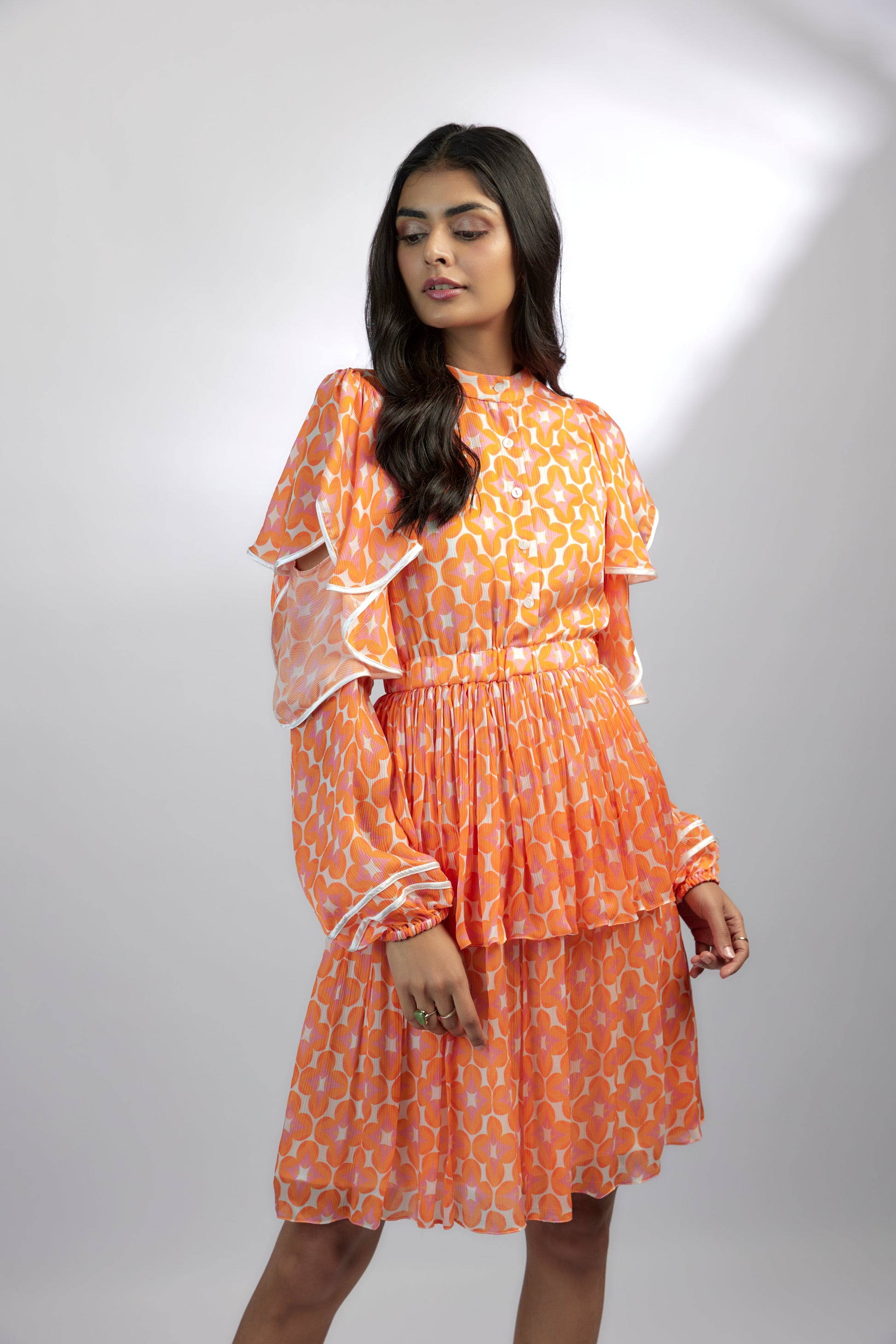 The Tangello Mini Dress is a eye-catching piece that features a front button down opening. Our buttons are made out of natural shell material. The sleeves have cold shoulder ruffle with white cording detail on the sleeves. The dress has 2 tier ruffles for playful yet dramatic charm.