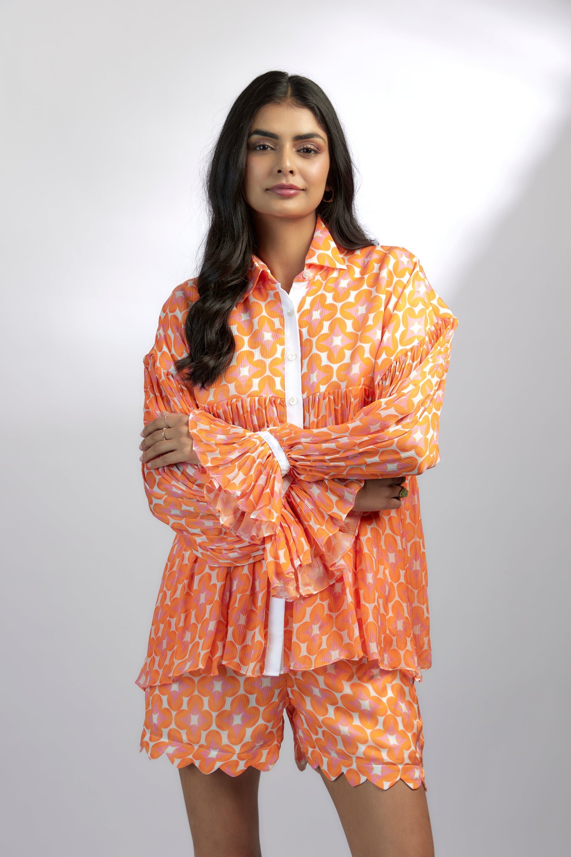 The Tangello Top features dropped shoulders, ruffle cuffs, and white panel detailing. It has a front button down opening. Crafted for both style and comfort. It's a must have vacation wear.
