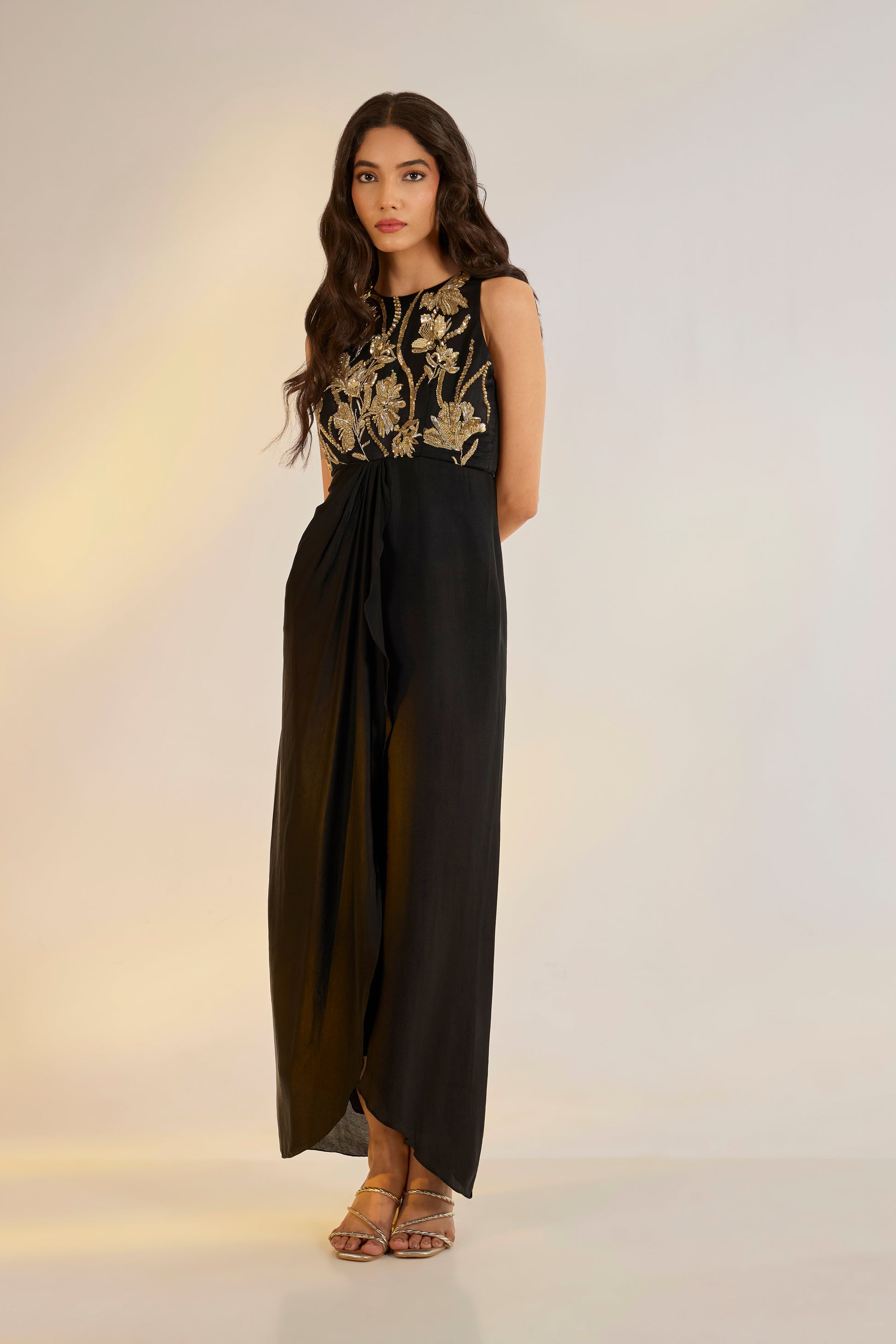 The Tara Draped Gown is a statement evening silhouette in rich violet crepe, featuring intricate silver floral embroidery on the bodice. With a flattering in-cut neckline and a soft front drape that cascades into a subtle slit, it’s designed for quiet glamour and graceful movement.