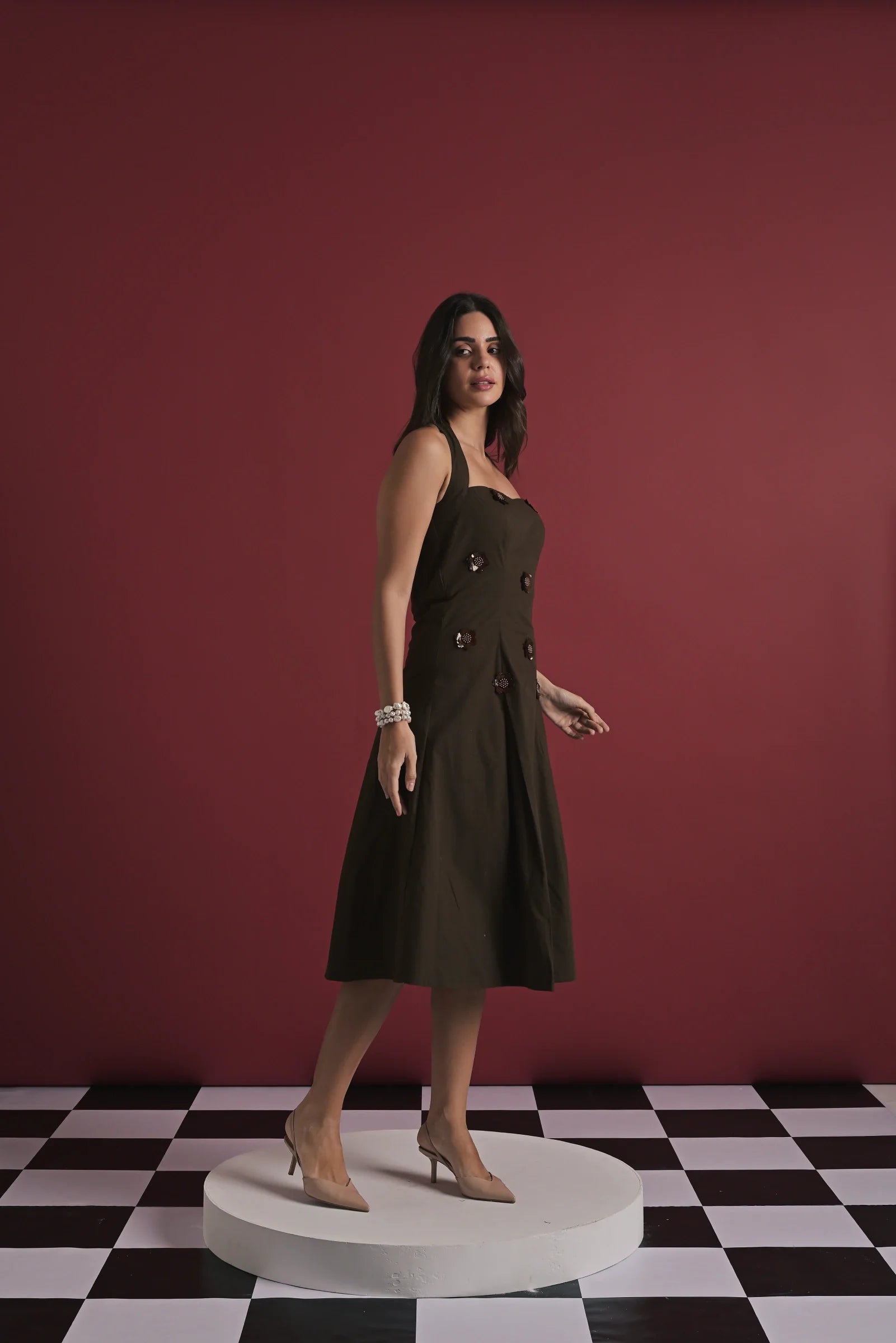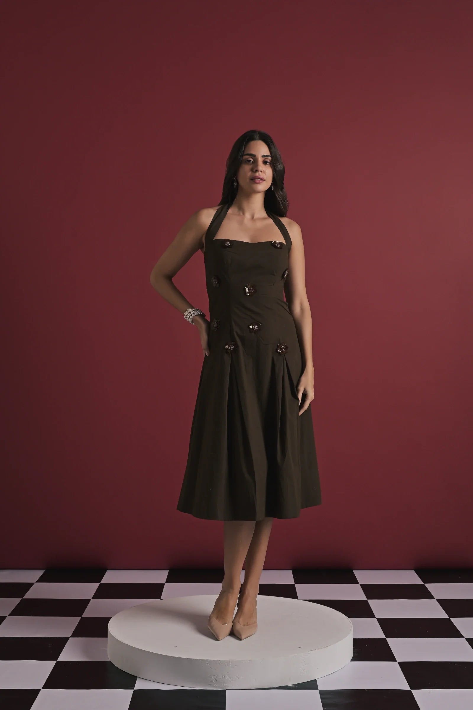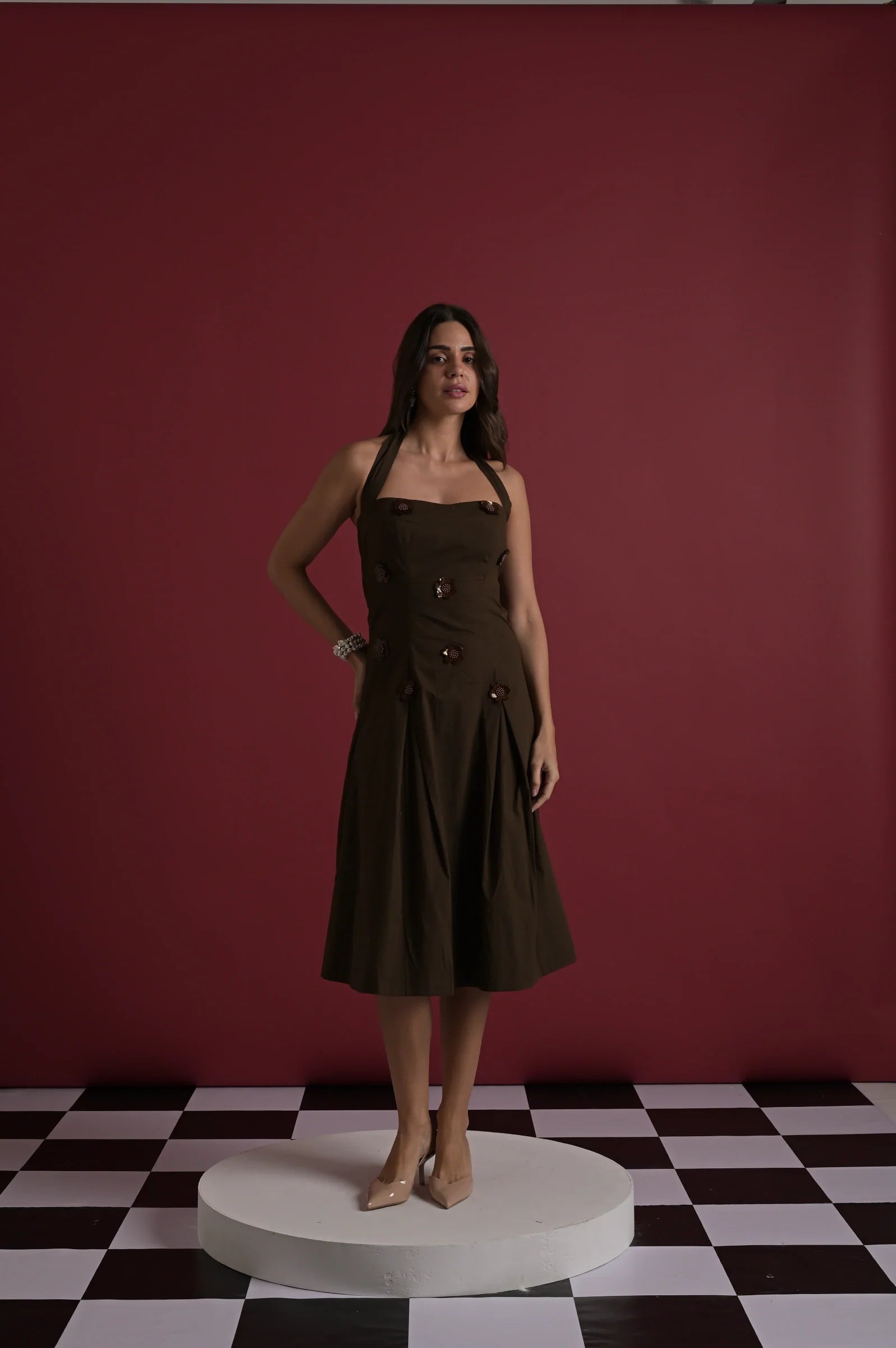 A sophisticated halter-neck midi dress in a deep, earthy tone, designed with a softly structured bodice and a graceful flared silhouette. Delicate floral embellishments add subtle texture and dimension, while gentle pleating through the skirt creates elegant movement, making it perfect for refined evenings and elevated daytime occasions. Shown on a model wearing size XS, with a height of 5'7".