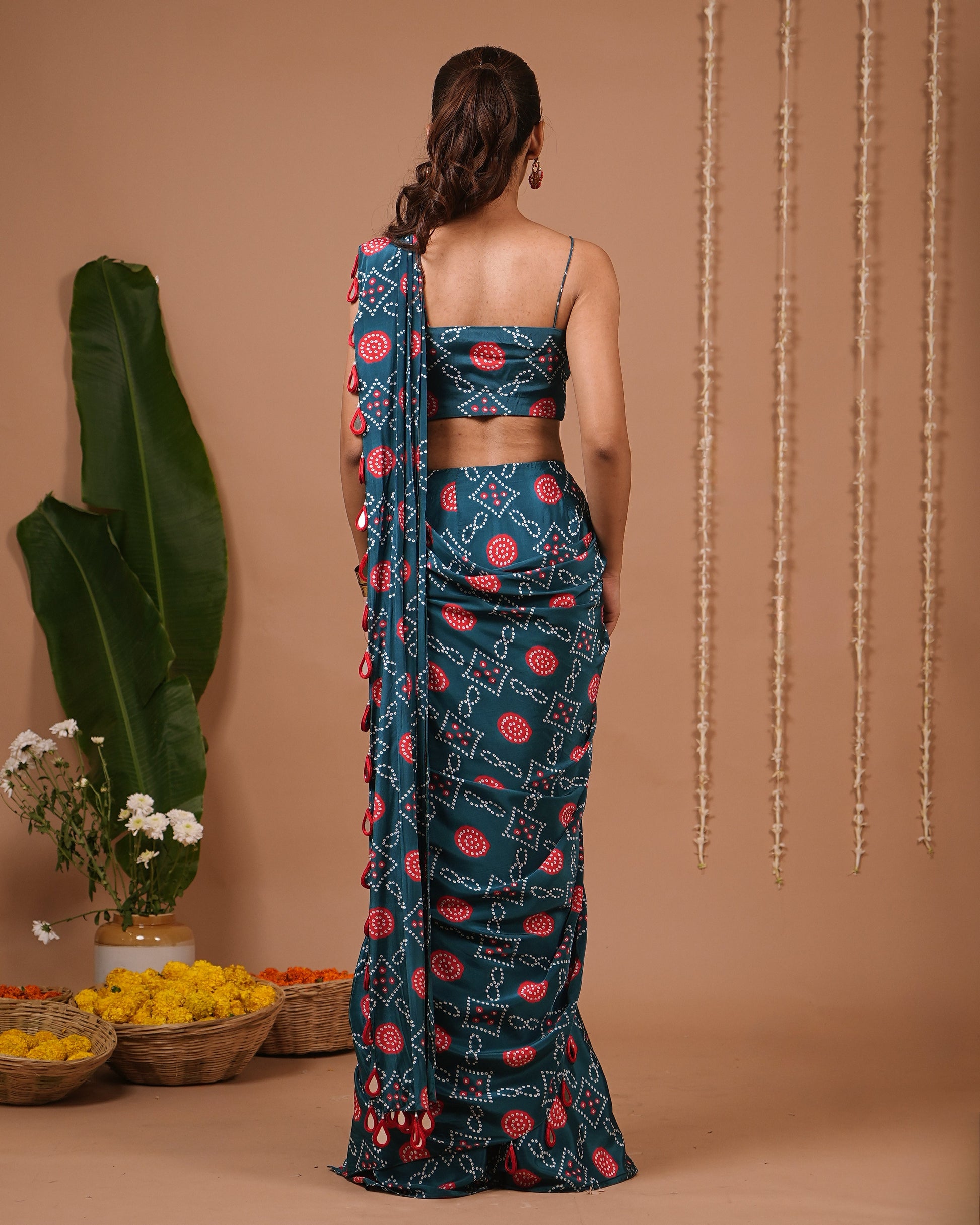 Teal Blue-Red Bandhej Printed Drape Saree (Set of 2)