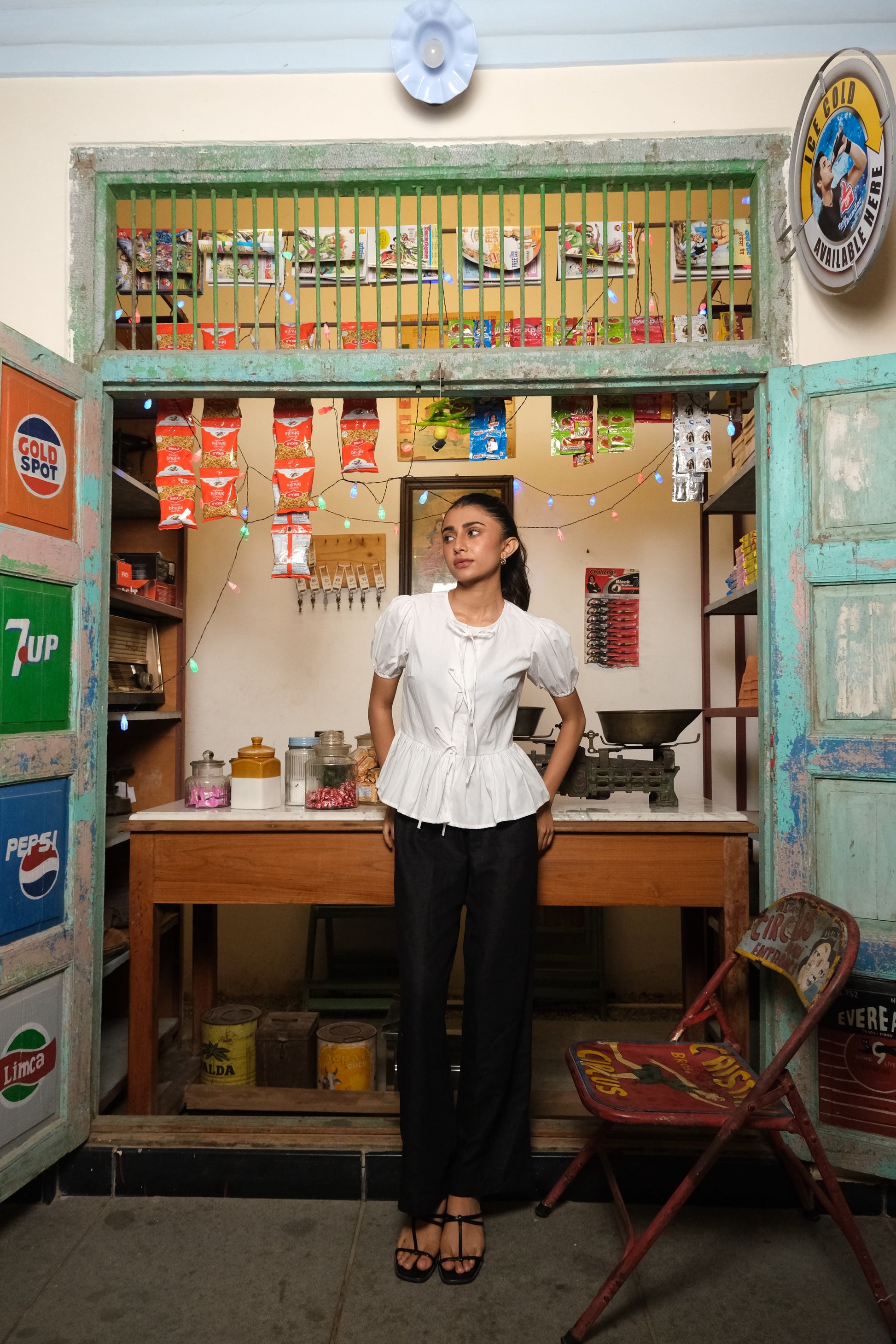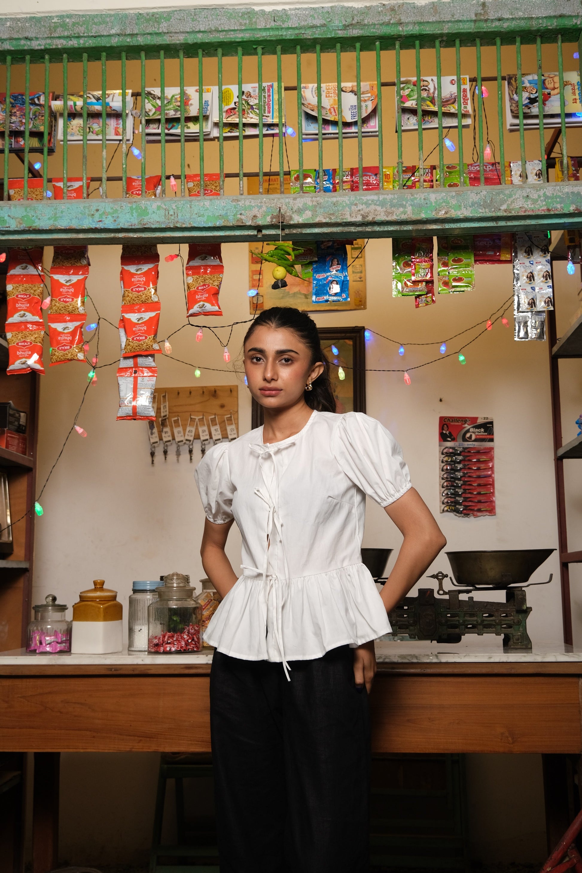 Sweet, playful, and effortlessly chic—this tie-up peplum top is a wardrobe win. Designed with delicate front ties and soft gathers at the waist, it brings just the right amount of volume and flair. The puff sleeves add a feminine touch, while the airy cotton fabric keeps you comfortable all day.