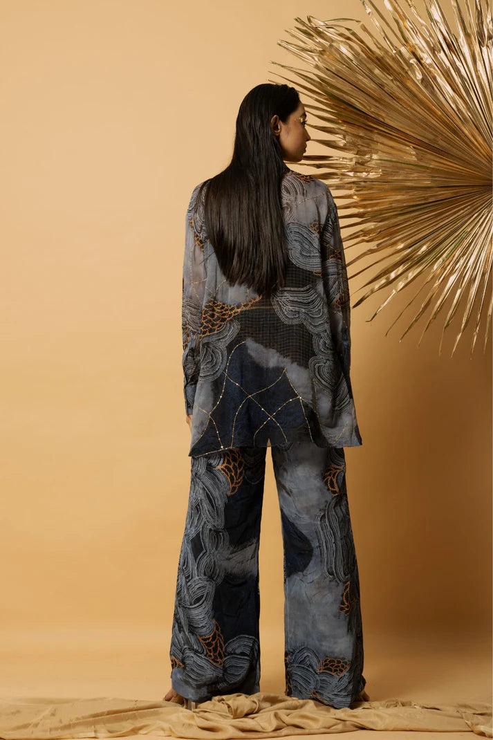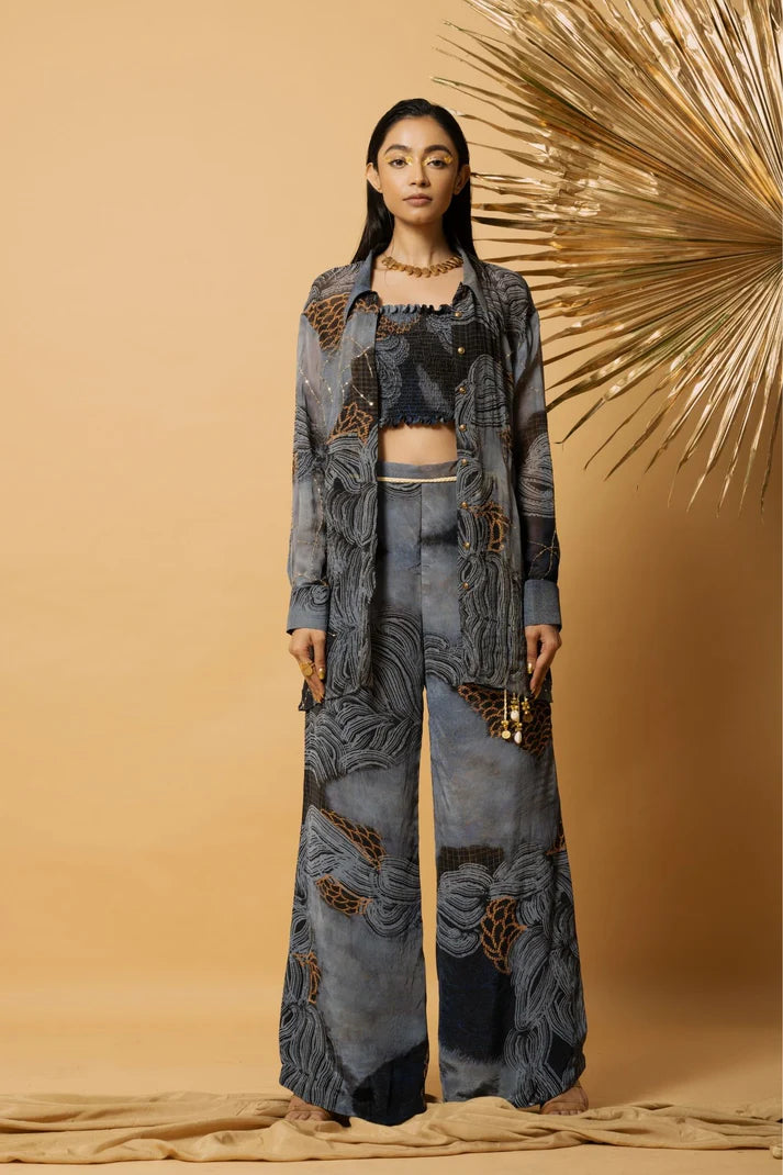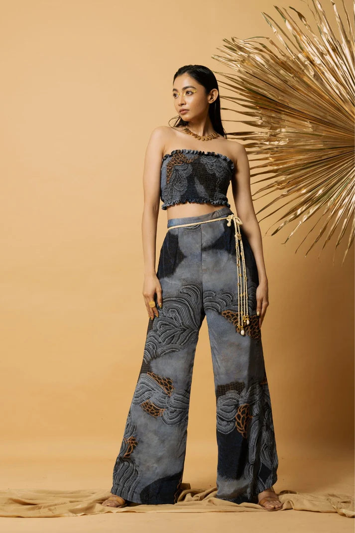 Smocked bralette paired with straight pants and hand embroidered shirt
