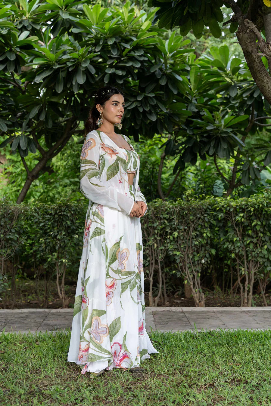 tropical leaves and floral print three layer sharara paired with blouse and full sleeves long flared shrug
