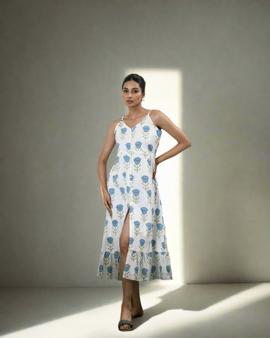 Be effortlessly feminine and stylish in our strappy tulip kiss dress. Perfect for summer and everyday wear, this adorable dress is crafted with our unique hand block printed white mulmul fabric. The strappy design, expertly tailored bodice, and charming frills give a graceful and breezy silhouette. Pair it with sandals for a casual look or elevate it with heels for any event!