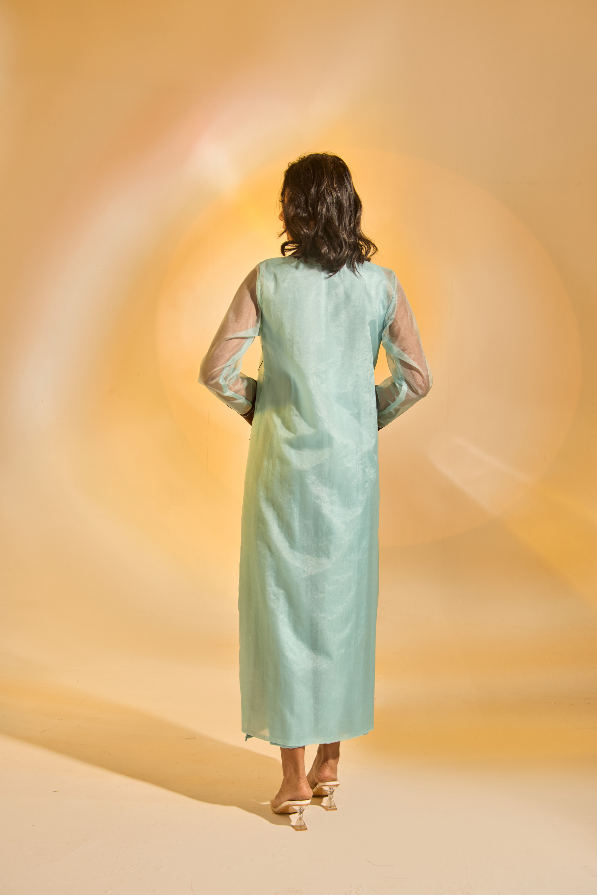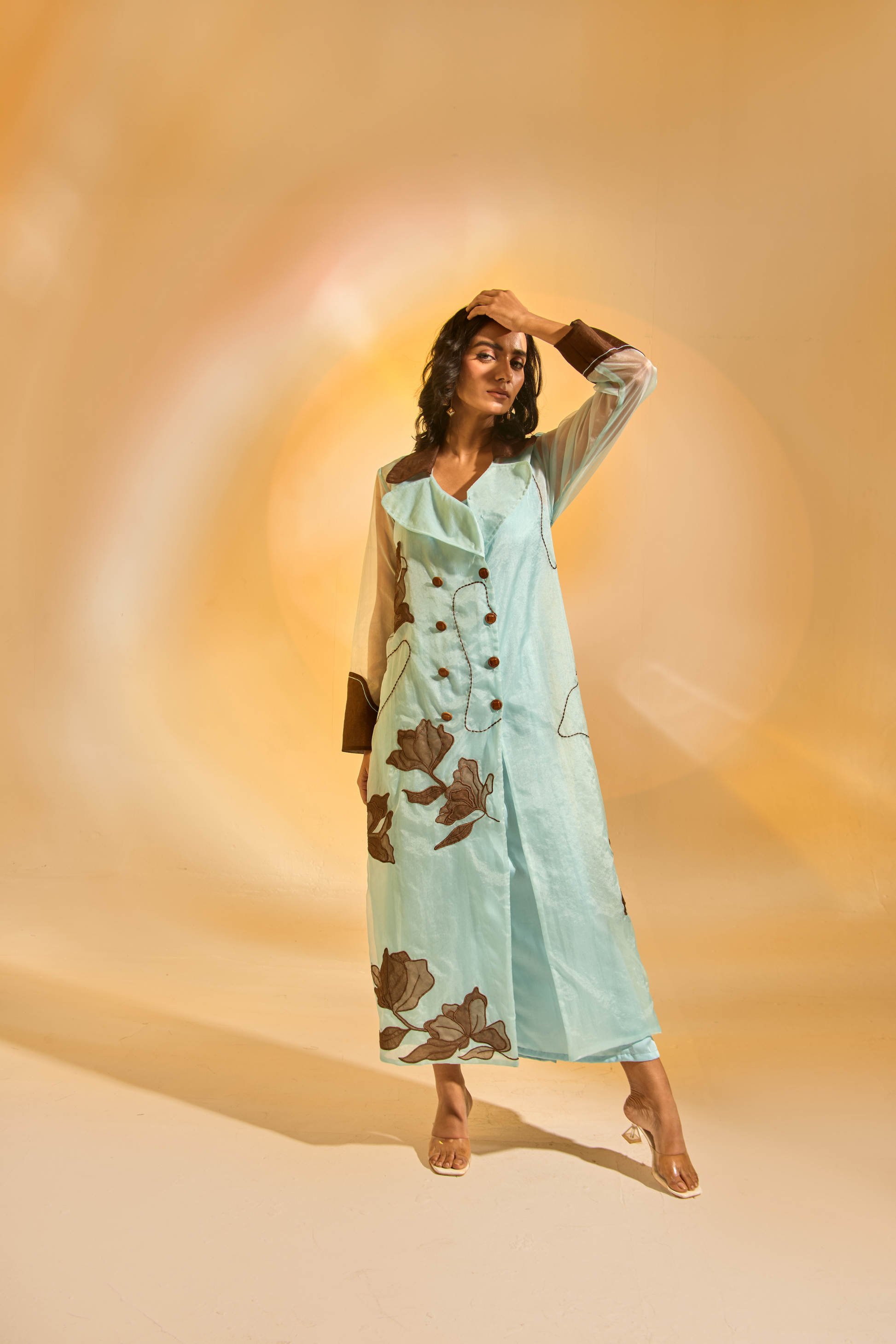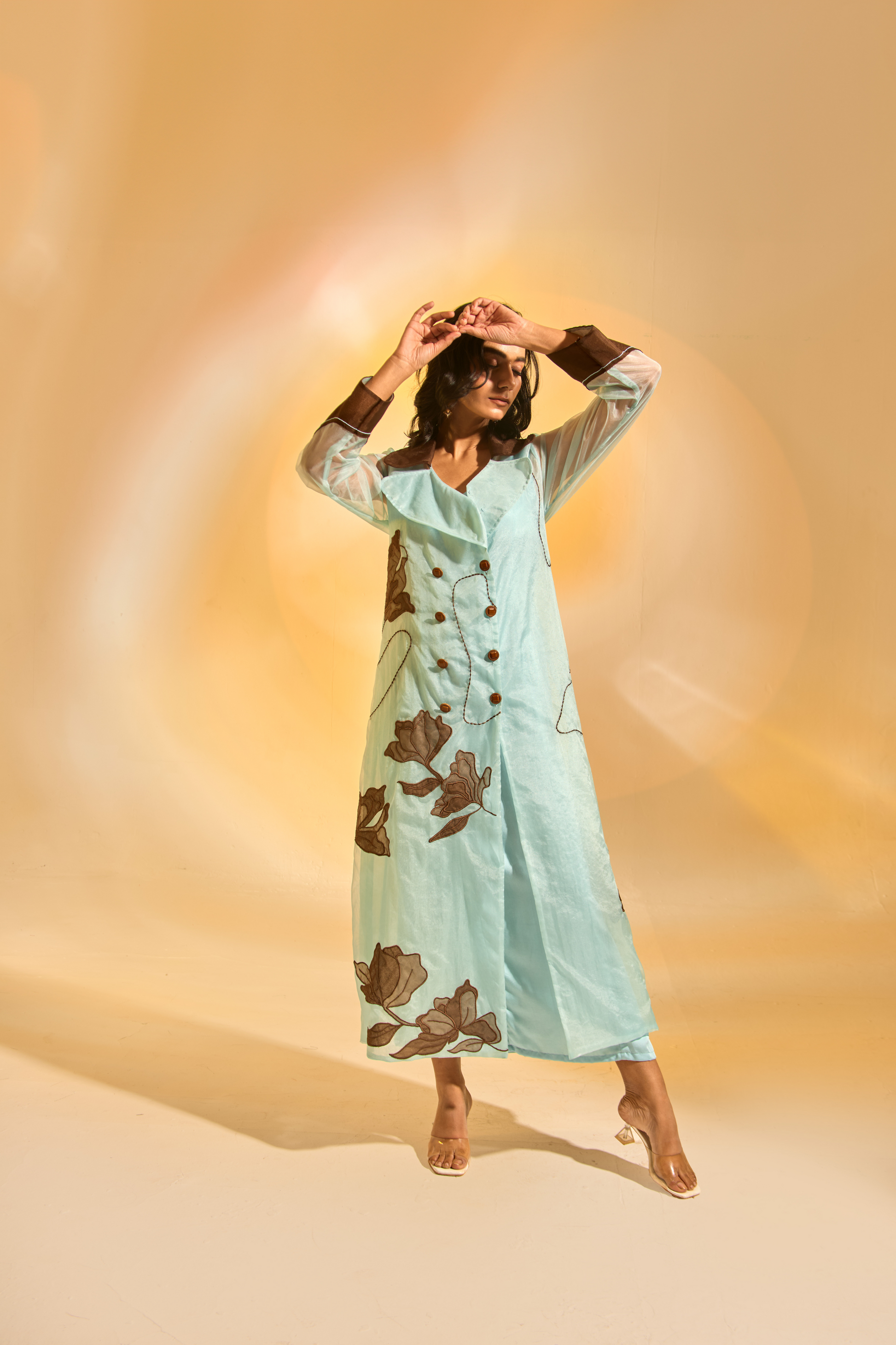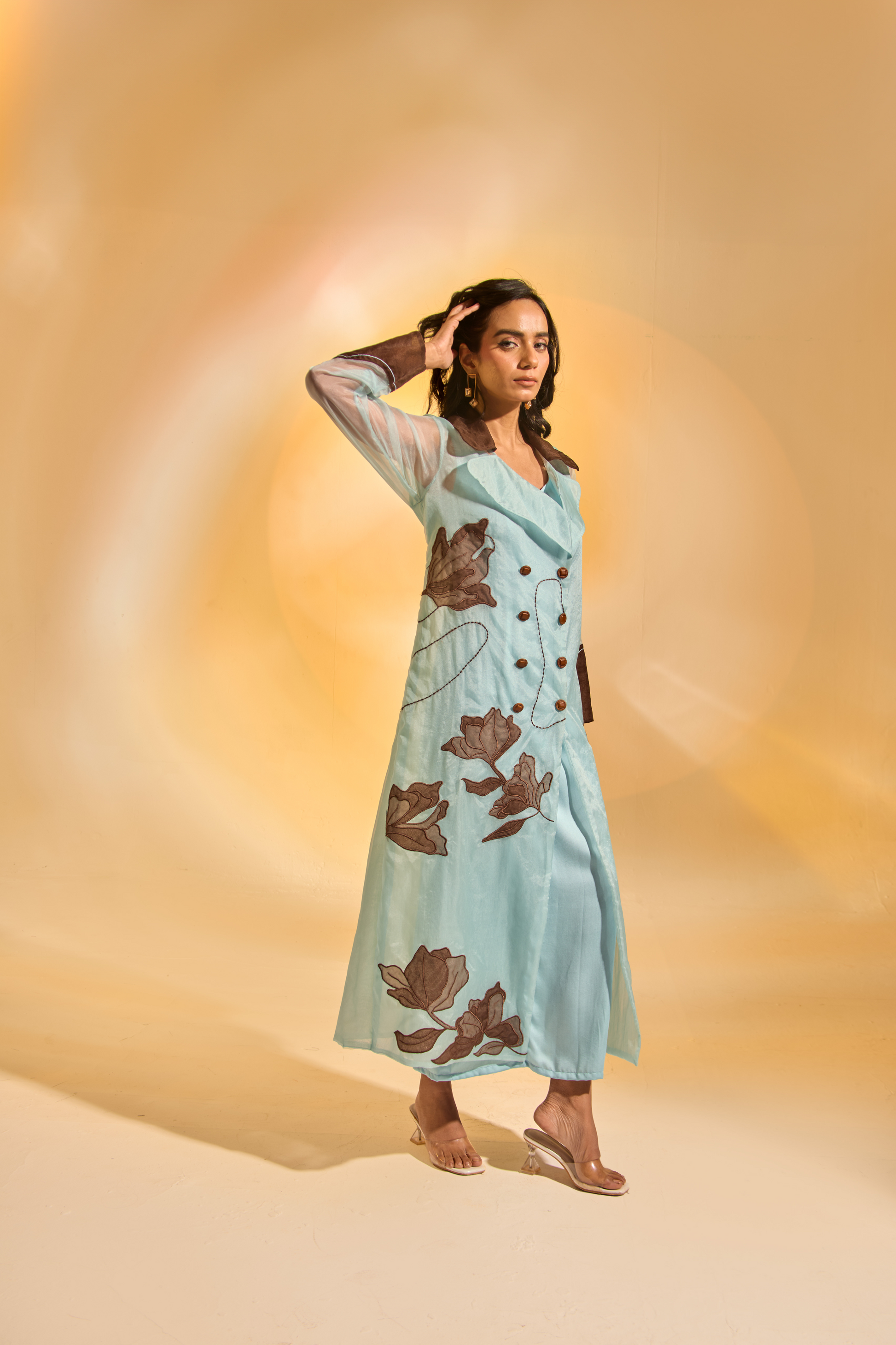 This organza jacket dress is designed to turn heads, featuring bold floral patchwork that adds a dramatic flair. The full-length camisole underneath ensures comfort and coverage, making it the perfect statement piece.