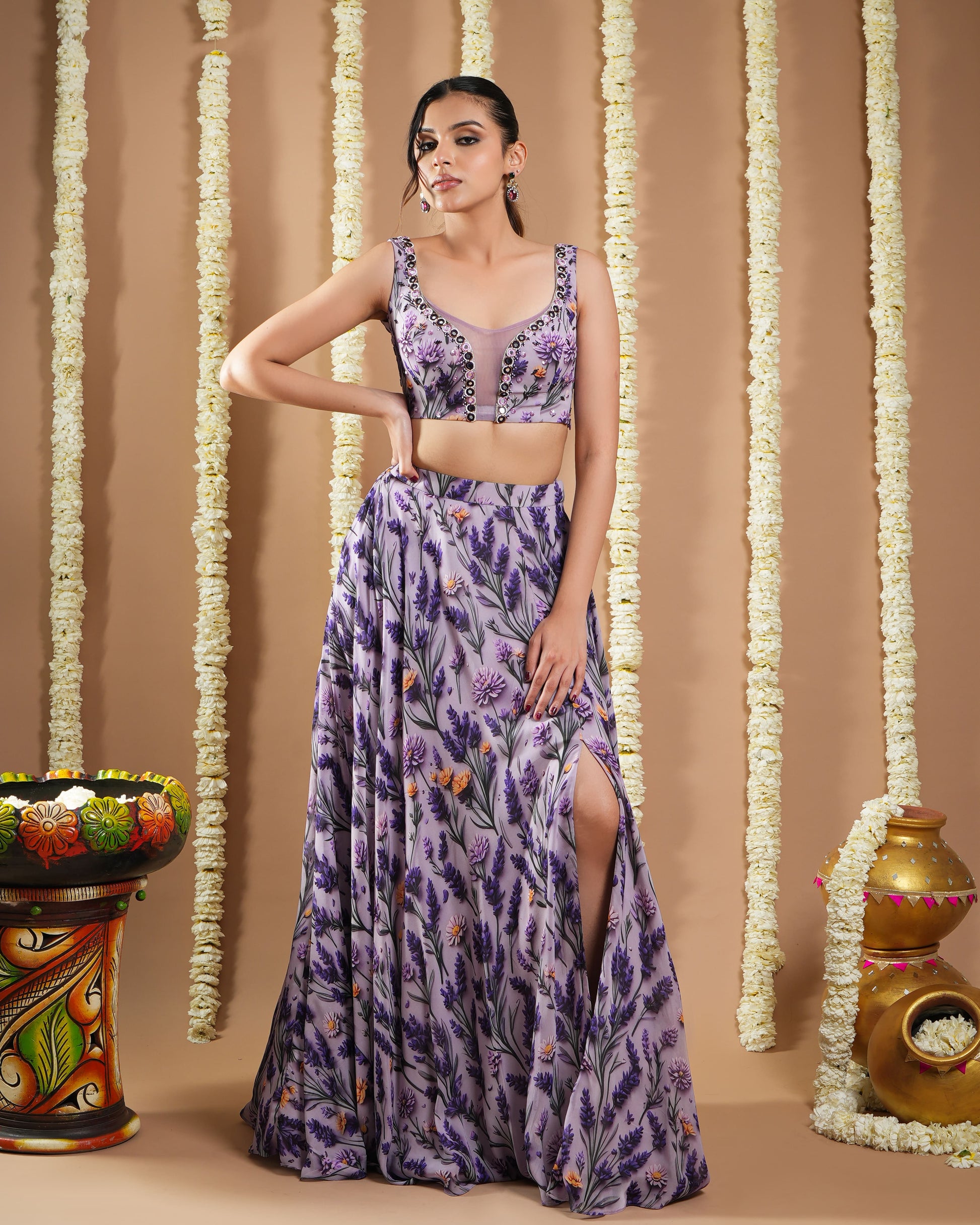 Violet-Lilac Printed Indo Lehenga Set (Set Of 2)