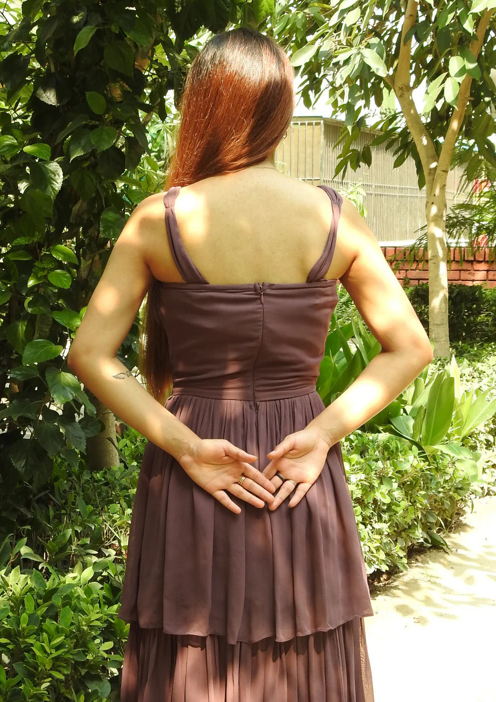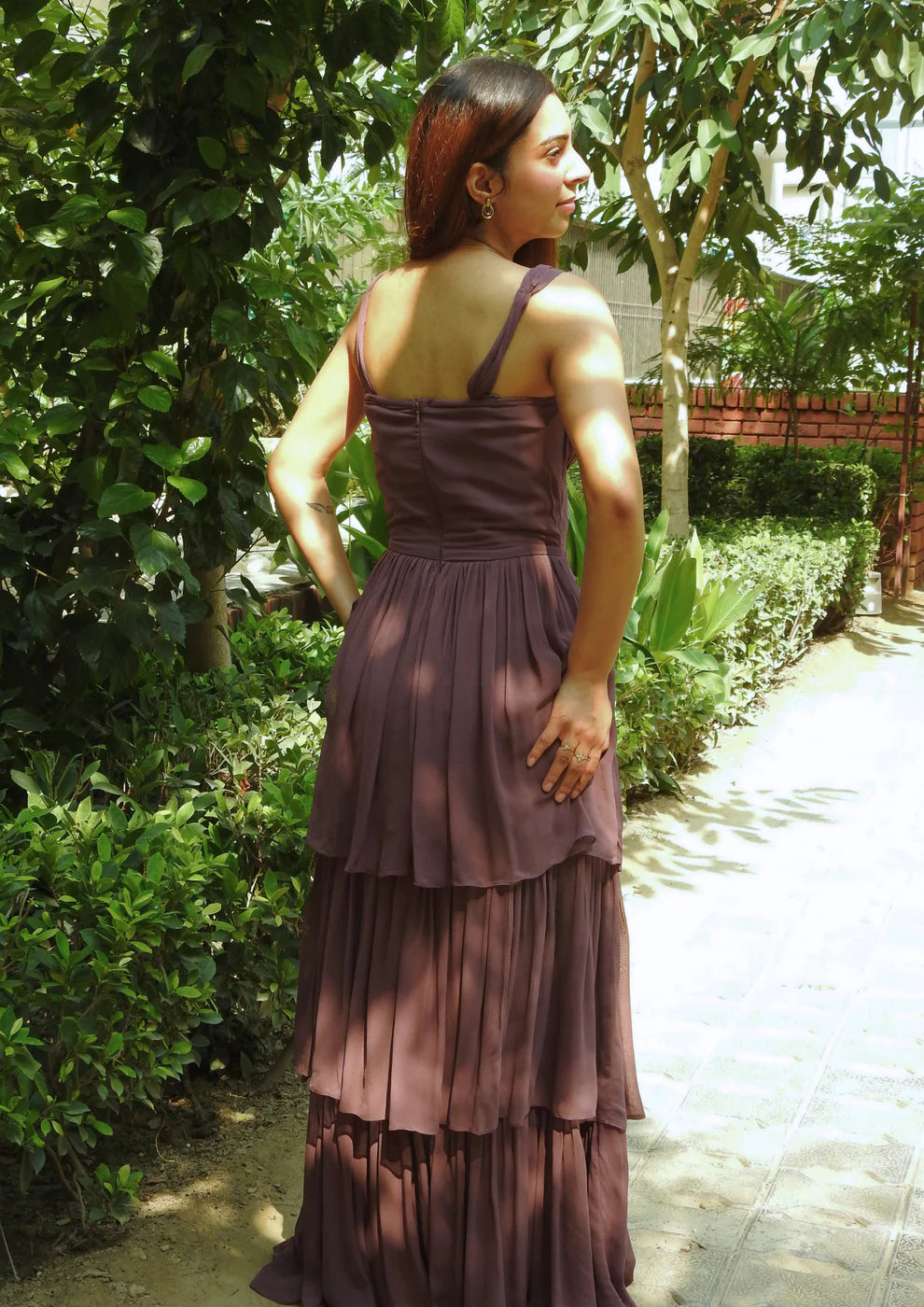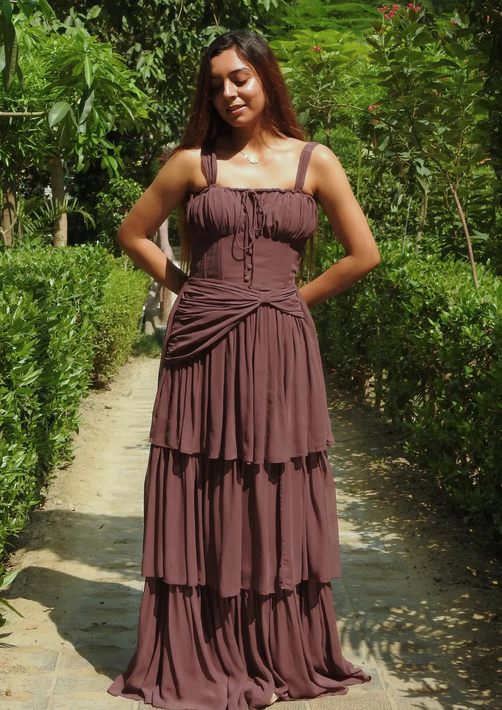 Timeless in every seam, burgundy dream with a quiet gleam — the Vionette bustier flows with soft gathers, a tiered silhouette, and elegant drape.