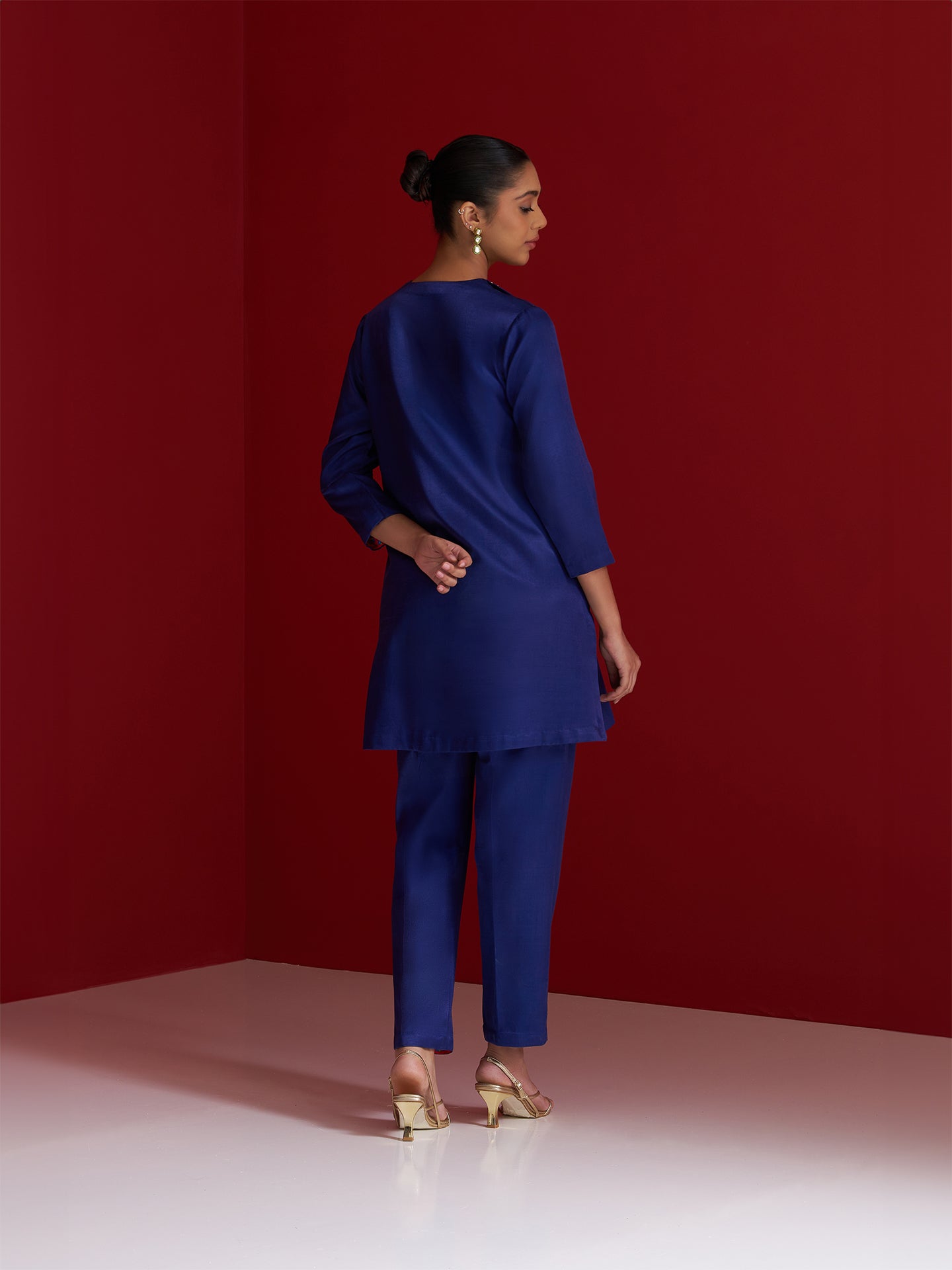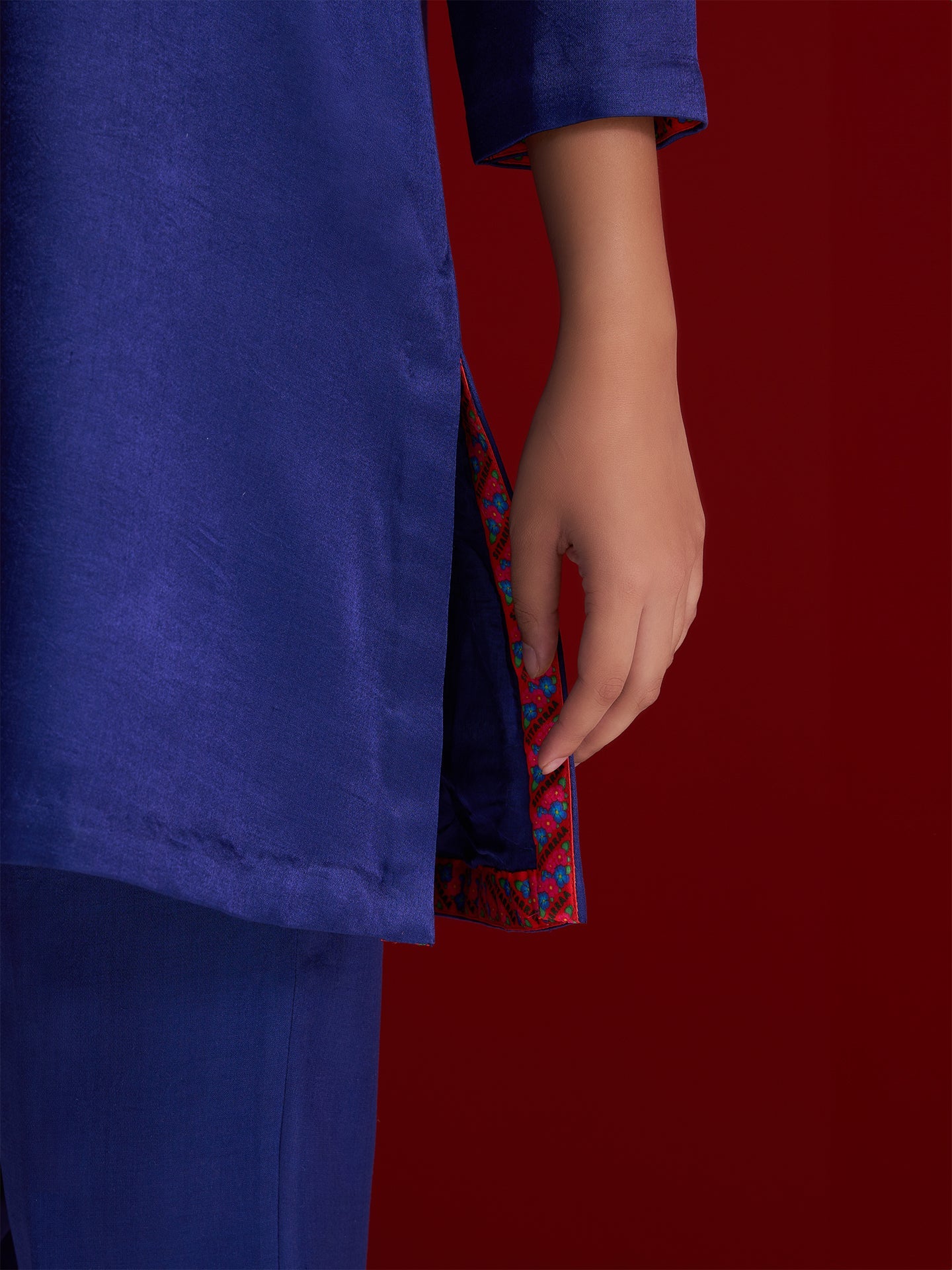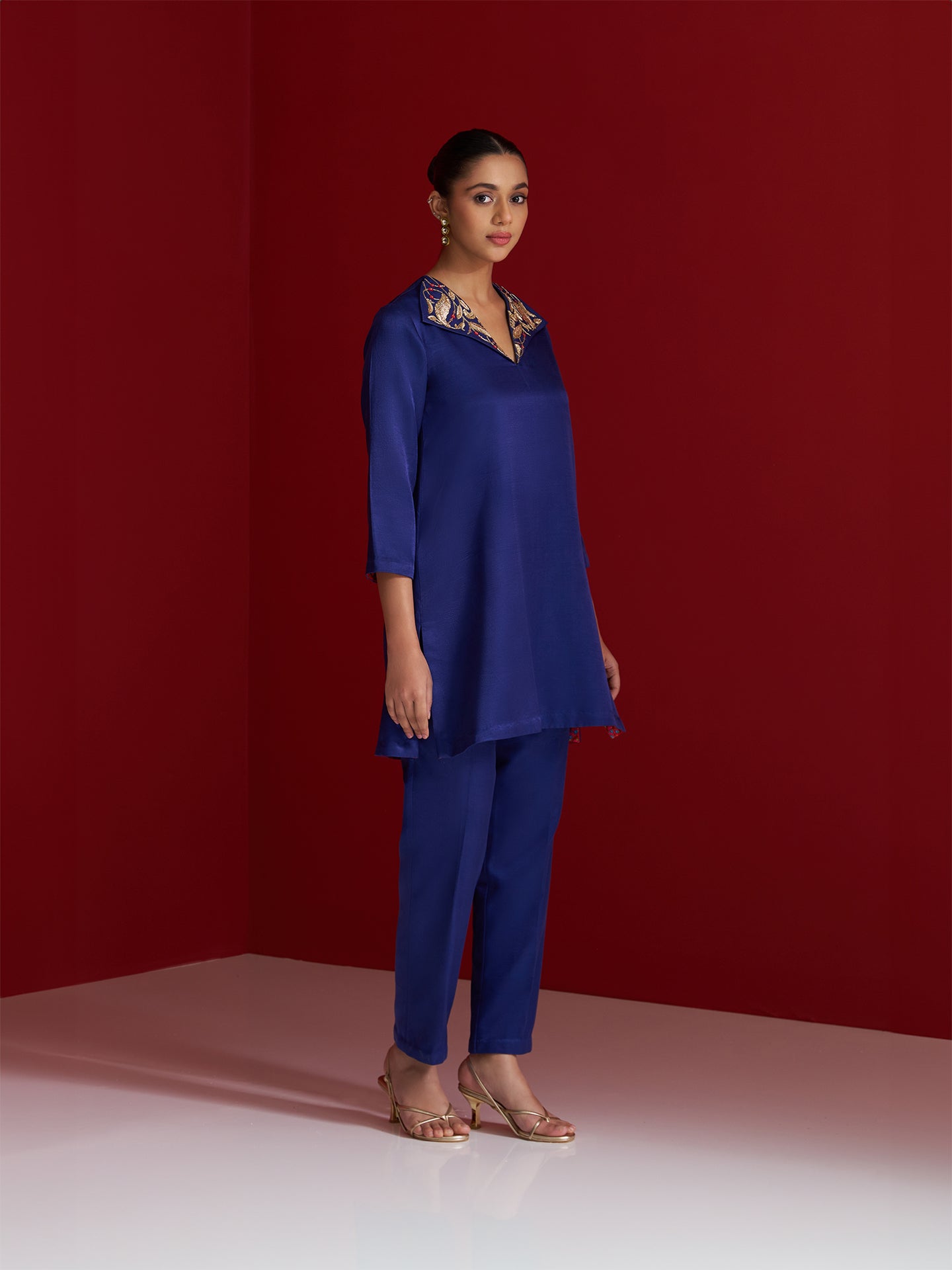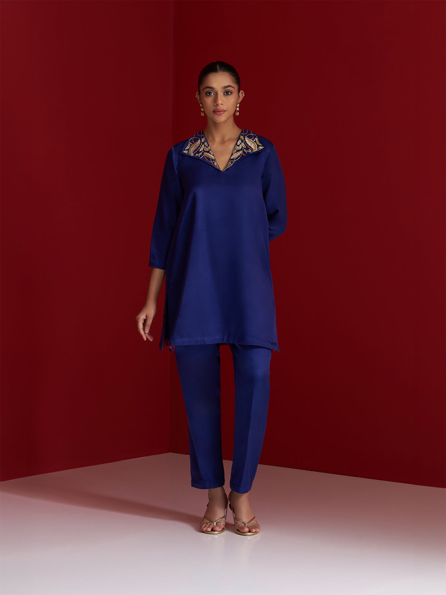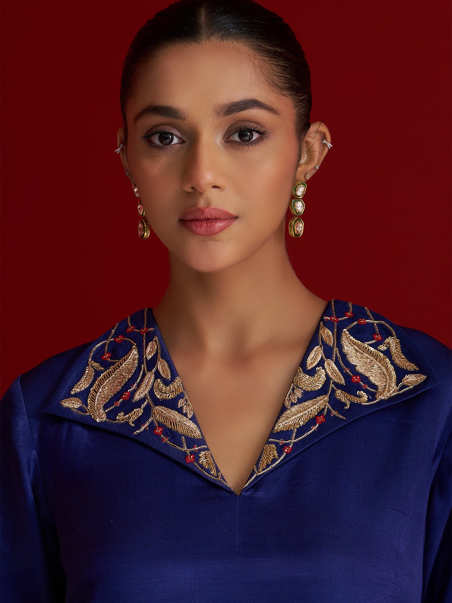 Crafted in luxurious Gajji silk, this blue kurta set embodies refined elegance with a modern edge. The kurta features a structured shawl collar, intricately hand-embroidered with delicate leaf motifs using dabka, naqshi, and striking red resham thread, adding depth and contrast to the rich base. It is paired with matching straight-cut pants.
