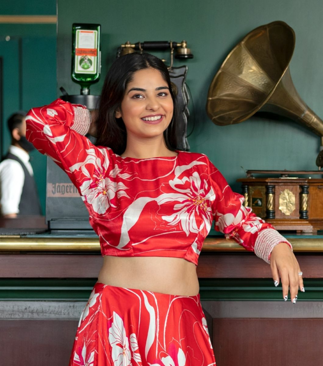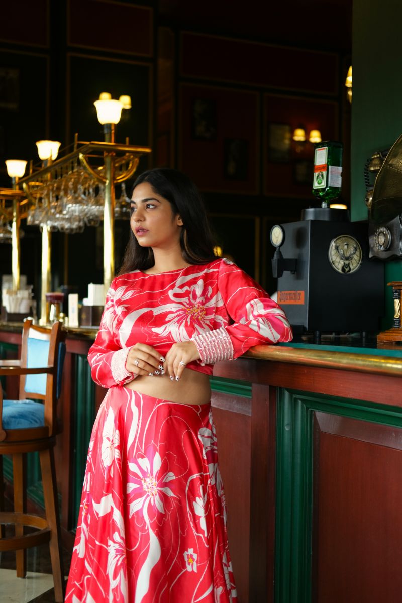 Wave Print Coord Set infuses rich traditions with modern prints. Ewoke features this digital printed skirt and top set that you can wear for your next destination wedding. The cuff at the sleeves is hand embroidered with pearls, bugel beads and sequins in ivory color which adds to the elegant blouse. The skirt is a full circle skirt.