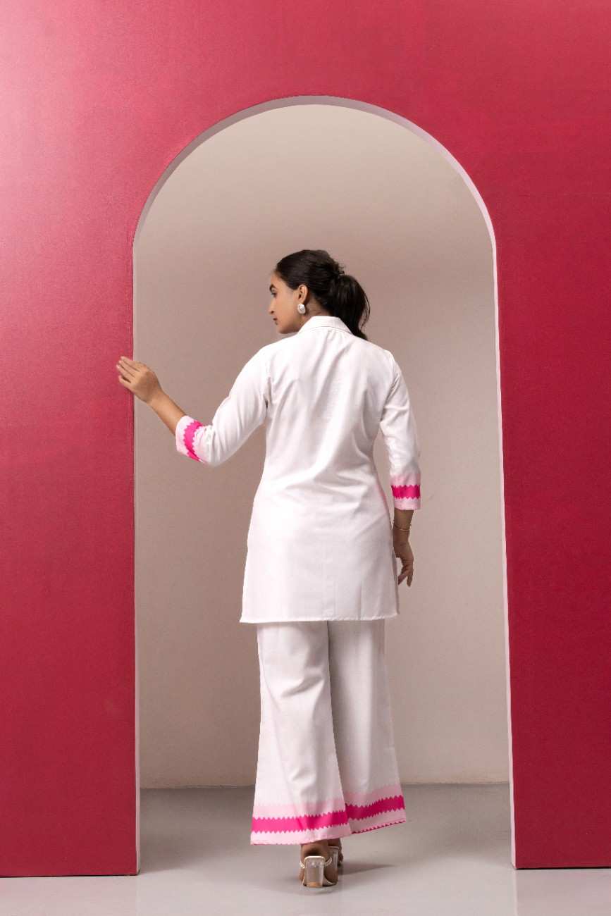 Coordinated Set: It is a two-piece set with a matching white wide-leg pant, featuring a pink zigzag border at the hem that complements the sleeve cuffs.