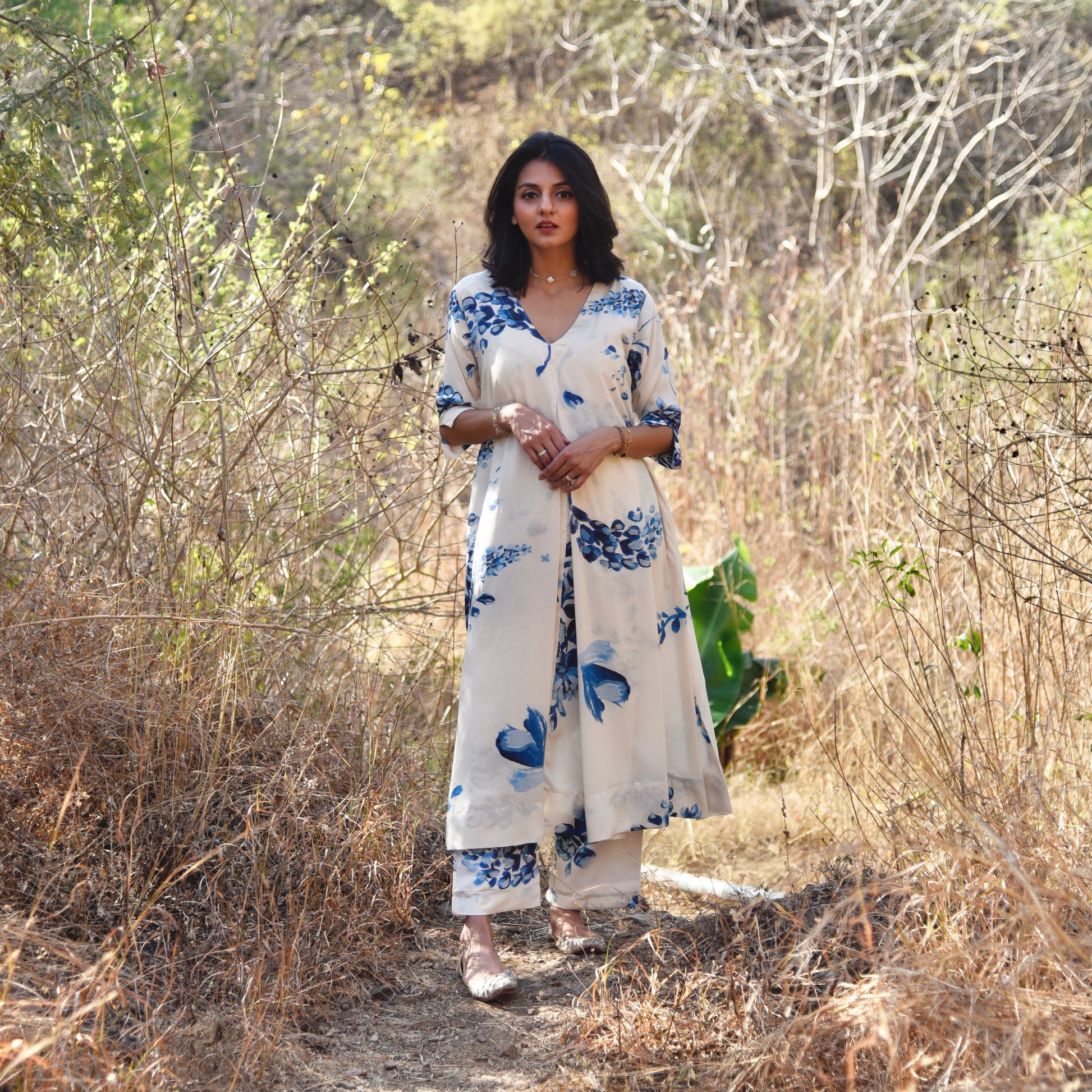 Introducing our white floral printed kurta set. This relaxed-fit piece showcases v neck. The kurta has box pleat in the centre which adds a lot of flare to the outfit. The pleats gives a fit and flare effect to the kurta. The straight 3/4 sleeves have a cut detail at the end, adding a little fun to the ensemble. The pants are narrow fitted with elastic at the waist. Crafted from luxurious modal fabric, the set boasts a lovely shine, elevating your look with a touch of glamour.