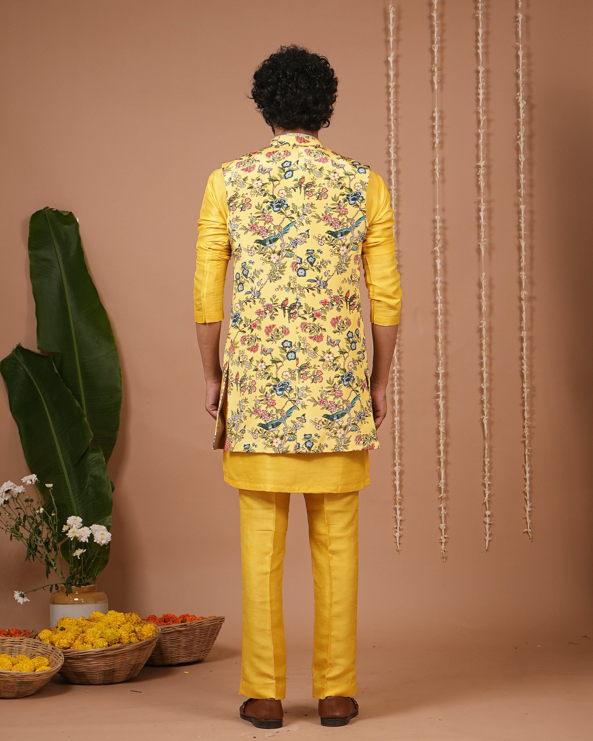 Jacket: Rich multicolor floral vine & bird print on a bright yellow base with embroidery highlights.