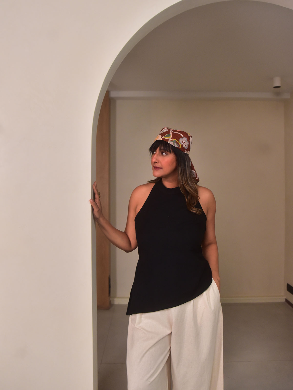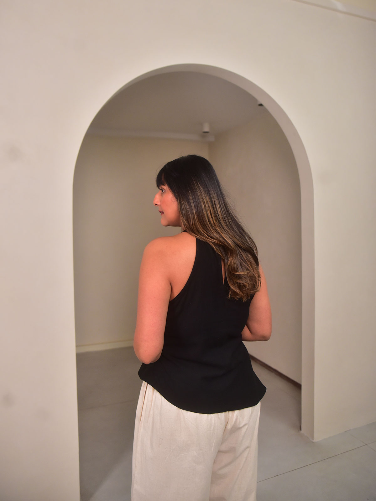 | This black dyed cotton linen halter top mirrors a sculpted, contemporary silhouette with a cinched waist and asymmetric hem. Finished with side zipper with hook-and-eye closure, it offers both structure and ease. Ideal for evening gatherings, celebrations, or elevated casual wear. Pair it with Amara pants and sleek heels for a timeless look. |