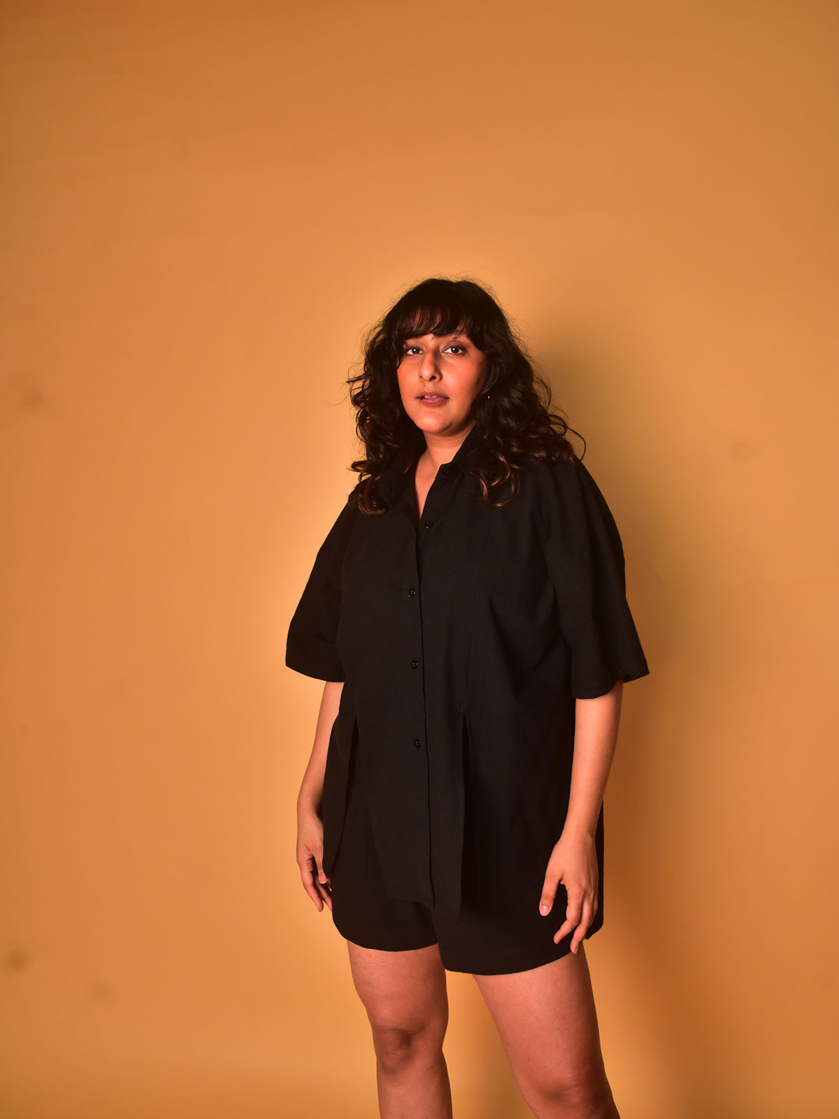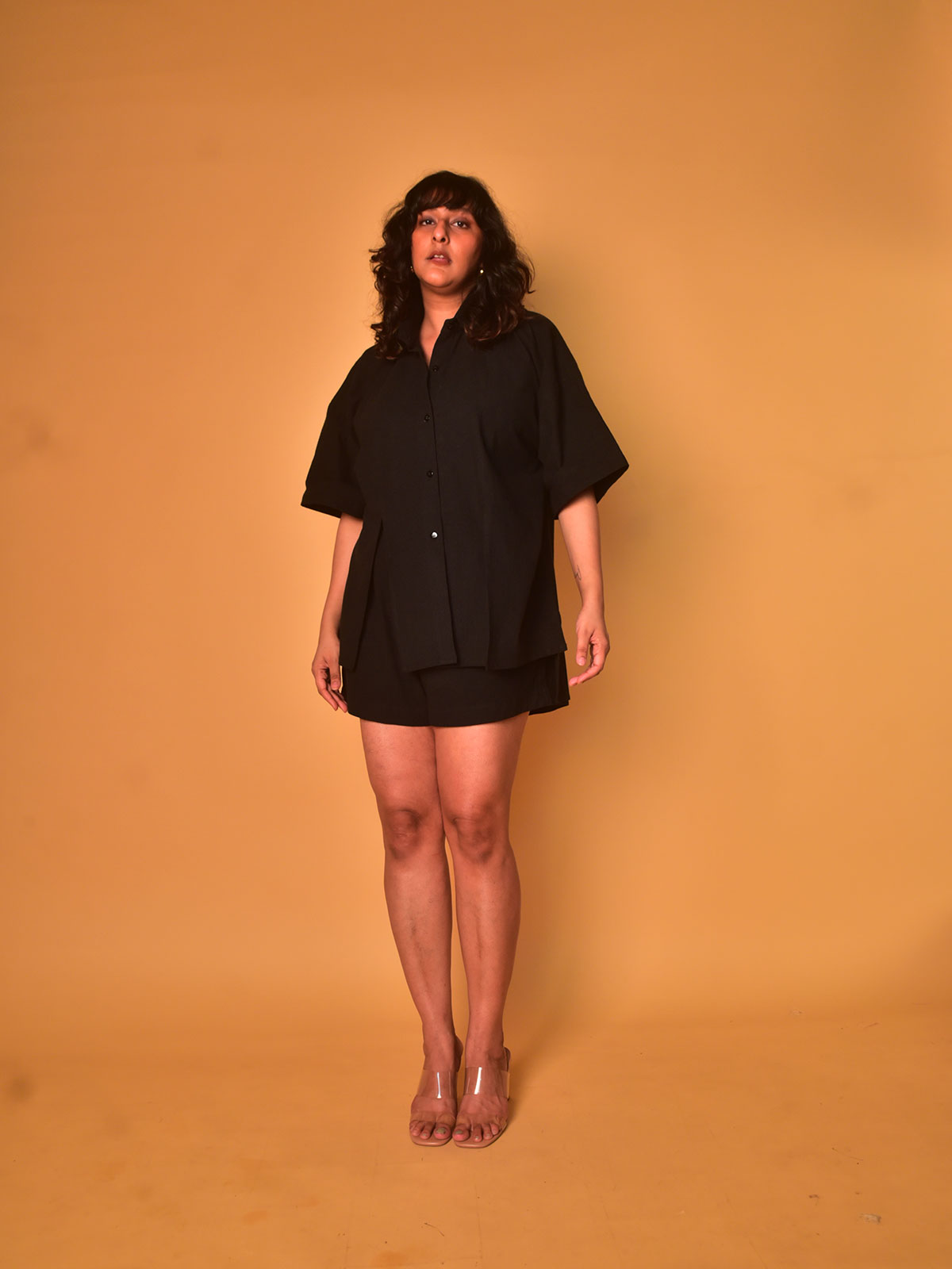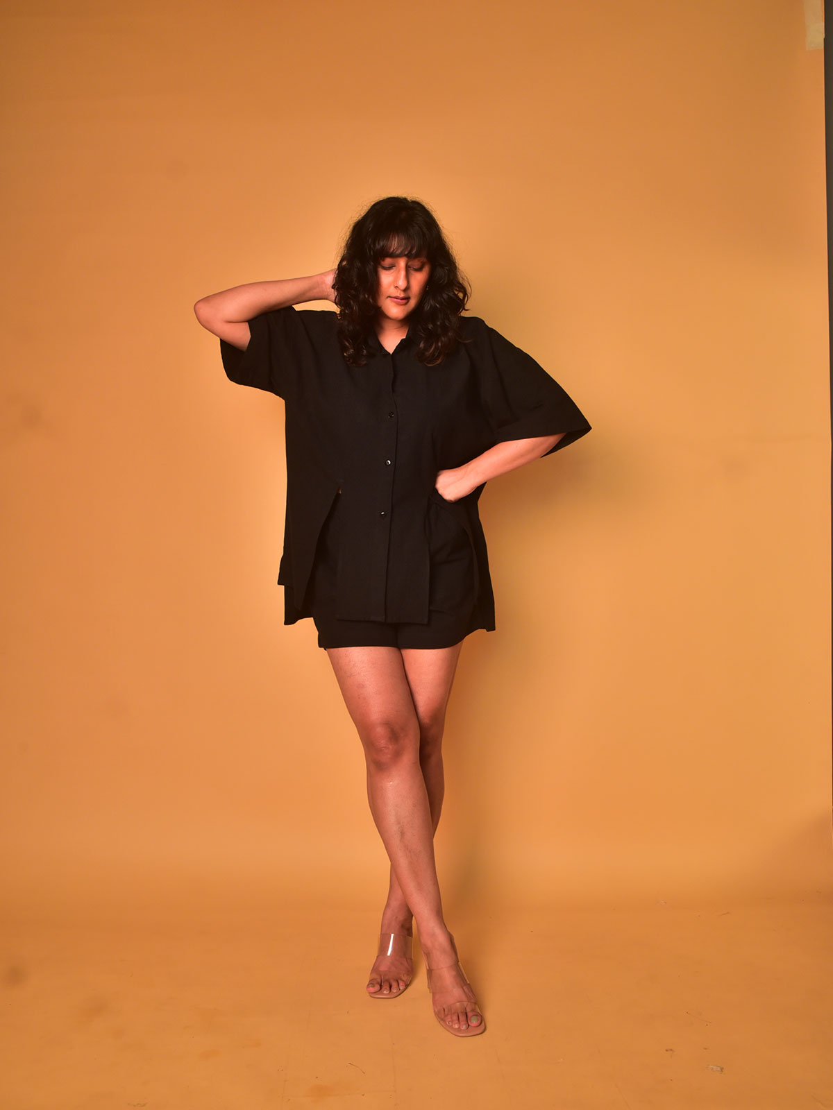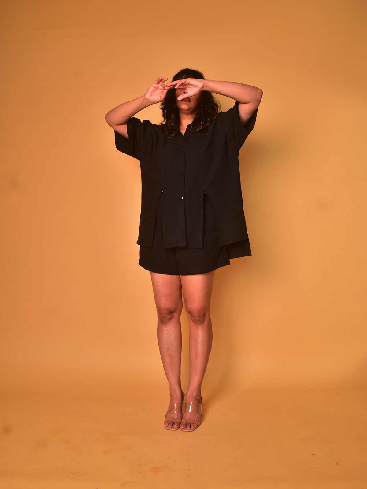 Slip into these classic black shorts for an effortless look. Crafted from crinkled cotton fabric, these tailored shorts offer both comfort and a polished appearance. They feature two pockets, an elastic waist band and all day comfort fit.